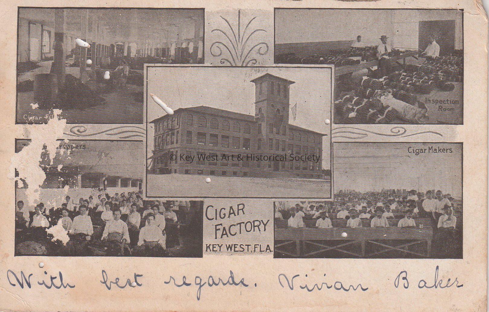 Postcard depicting interior and exterior photographs of a cigar factory. The caption reads, ‘Cigar Factory, Key West, Florida.’ The message on the front reads, ‘With best regards, Vivian Baker’. The card is addressed to Mr. John Hattrick, 2012 Latona Street, Southwest Station, Philadelphia, Pennsylvania, and is postmarked Key West, August 18, 1906 and Philadelphia, August 21, 1906.Collection