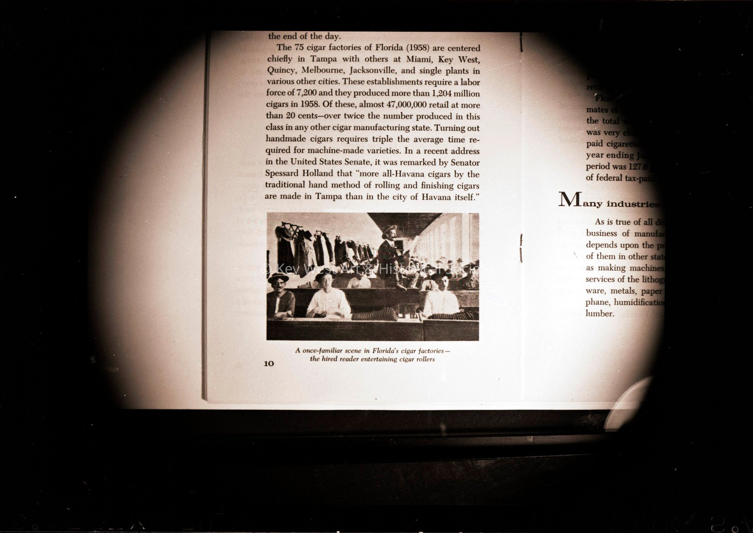 Black and white photographic negative depicting a cigar factory reader in a Florida factory.