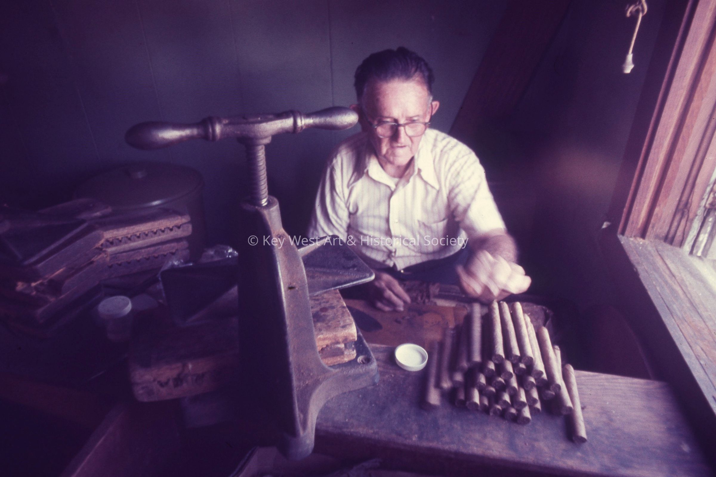 35mm color slide of Willard Bell rolling cigars by hand in The Tropical Cigar Factory. The factory was located at the corner of Fleming and Margaret streets.
