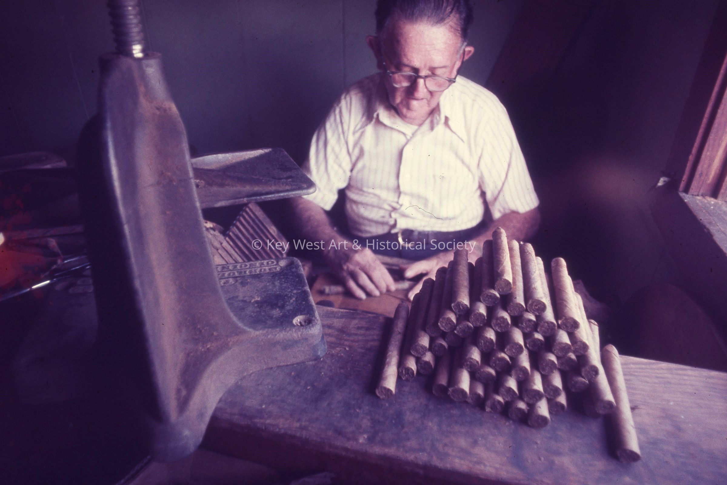 35mm color slide of Willard Bell rolling cigars by hand in The Tropical Cigar Factory. The factory was located at the corner of Fleming and Margaret streets.