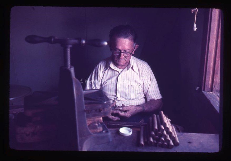 35mm color slide of Willard Bell rolling cigars by hand in The Tropical Cigar Factory. The factory was located at the corner of Fleming and Margaret streets.