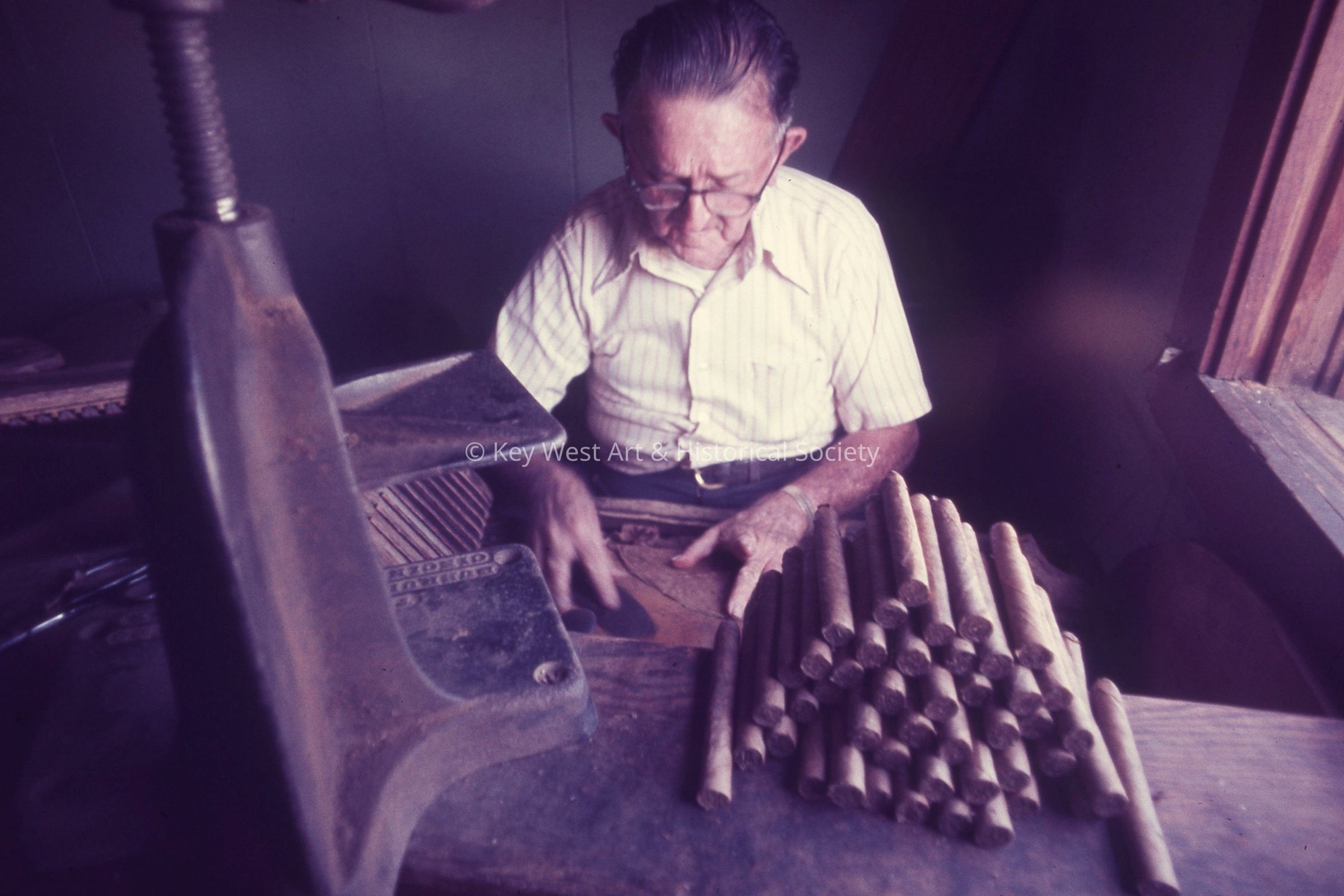 35mm color slide of Willard Bell rolling cigars by hand in The Tropical Cigar Factory. The factory was located at the corner of Fleming and Margaret streets.