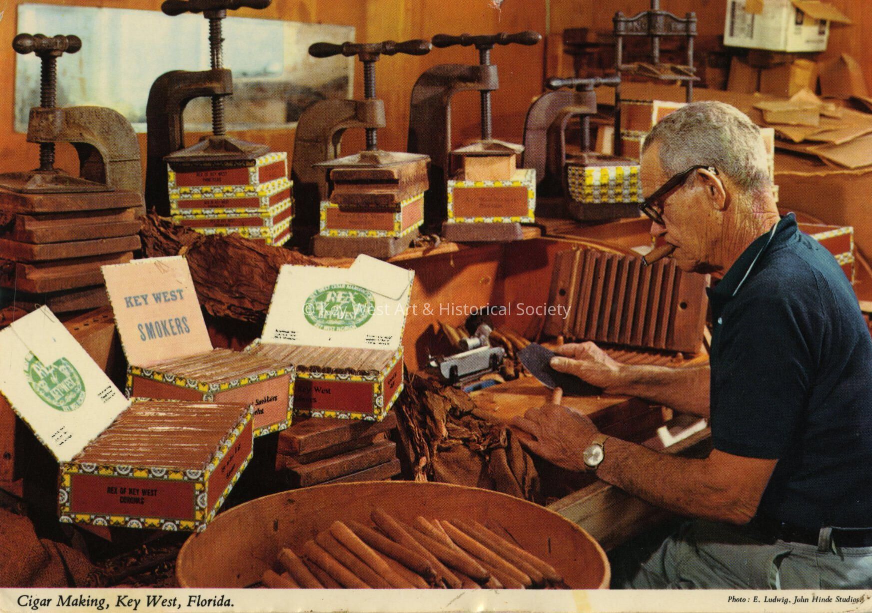 Postcard depicting a man rolling cigars. The description on the verso reads, 'Romantic old Key West is one of the few cities in the United States where the art of hand made cigars is still practised [sic]. This almost forgotten art has been handed down from the cigar makers that plied their trade in Havana, just across the Straits of Florida from Key West. The fine cigars that are made in Key West are sent all over the globe as well as the United States.'Subject Place