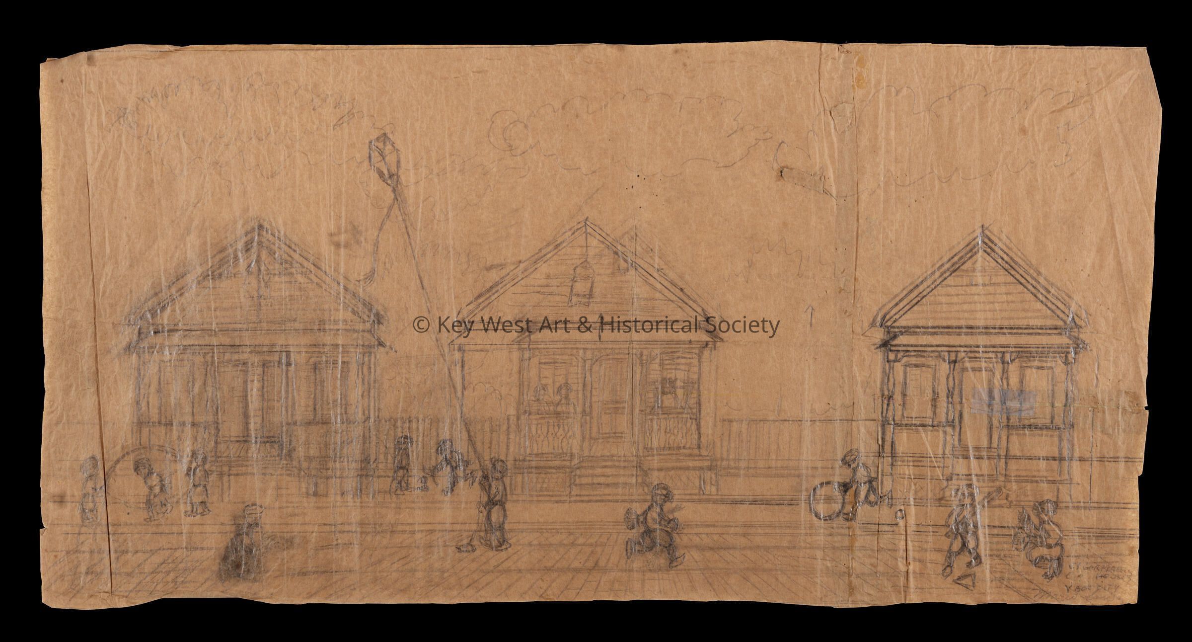 Pencil sketch on an unfolded paper bag by Mario Sanchez depicting children playing in the street in front of cigarmakers' cottages in Ybor City, Tampa.Type of Drawing