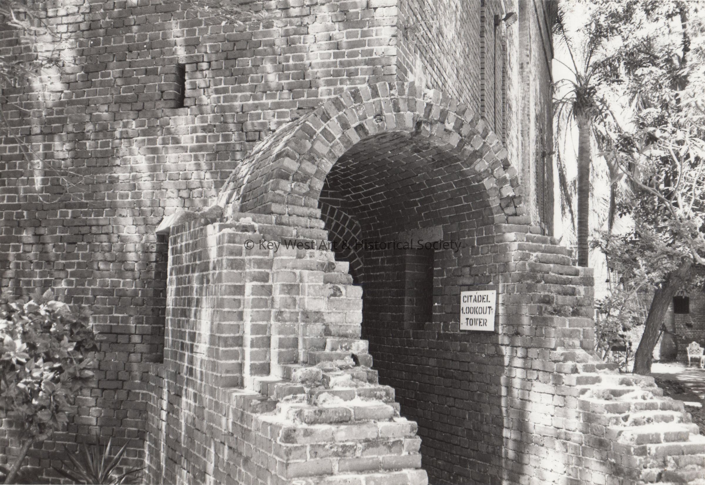 Black and white photograph of the entrance to the Citadel at Fort East Martello Museum.