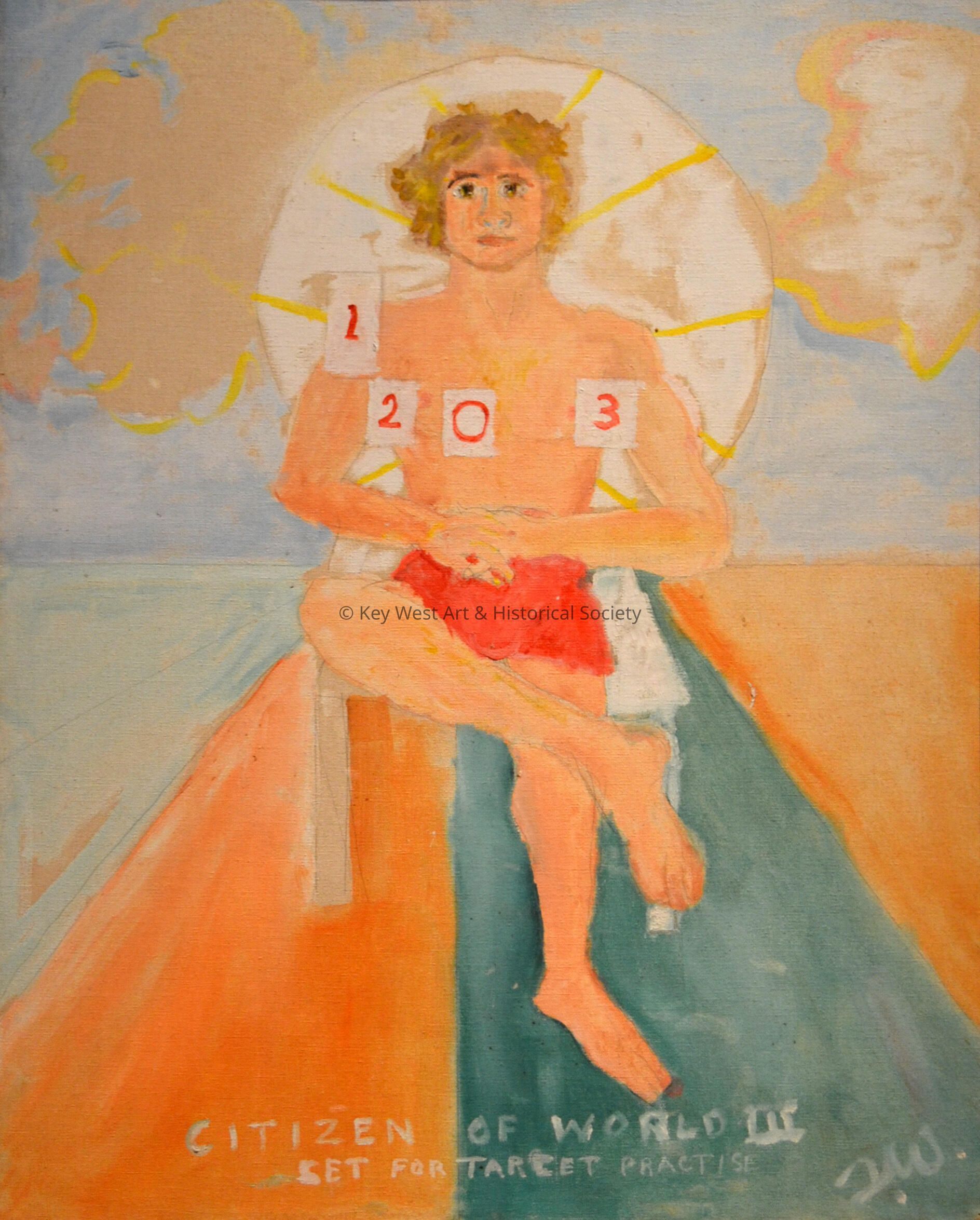 Oil and pencil on canvas by Tennessee Williams depicting an unidentified man sitting in a chair with number cards floating near his chest. This young man depicted in this painting is symbolic of Williams' acceptance about becoming a target due to his sexuality.Type of Painting