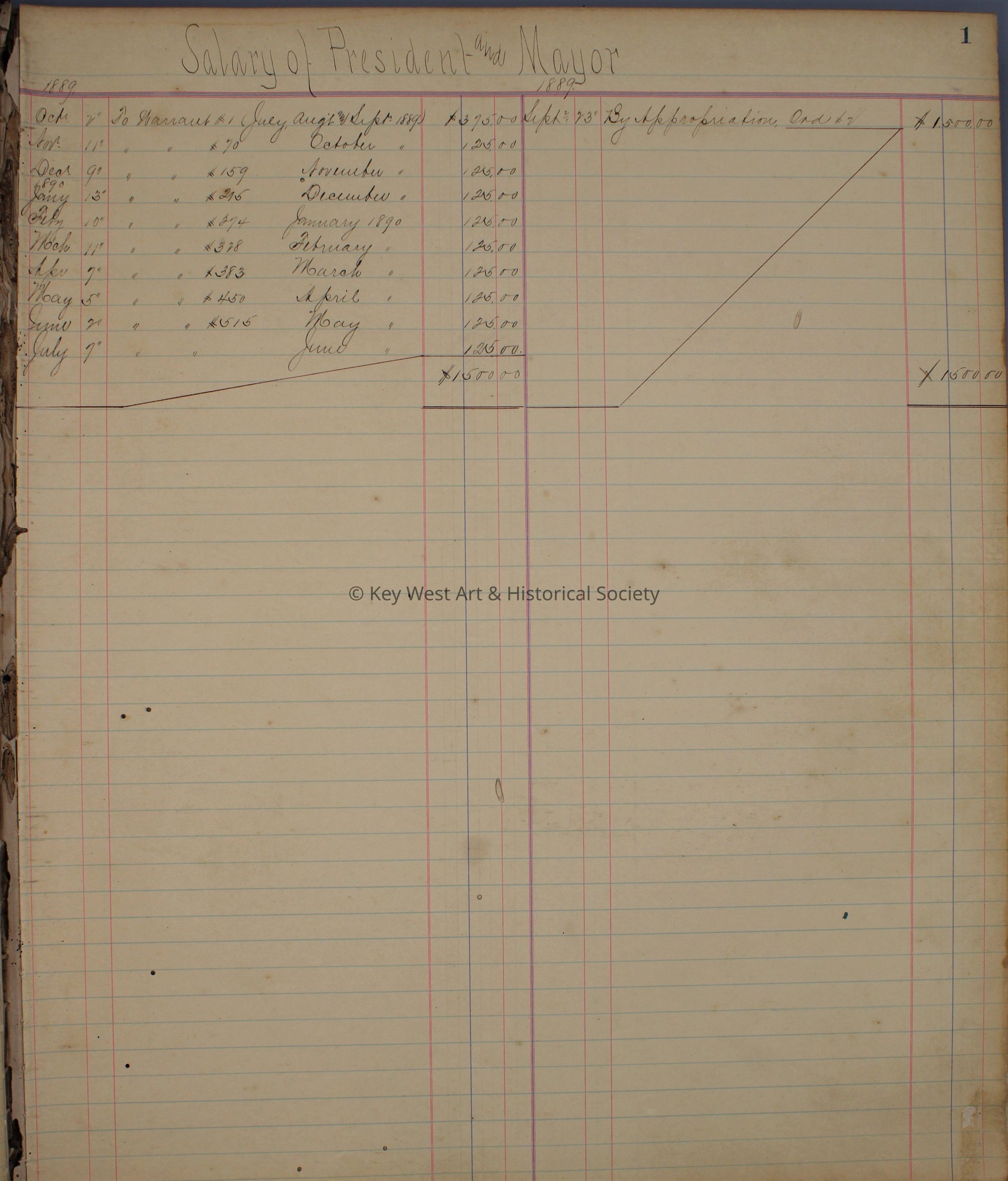 Ledger detailing general expenses for the City of Key West including salaries for city employees, street improvements, fire department operations, the Marine Hospital, and the Florida East Coast Railway.Collection