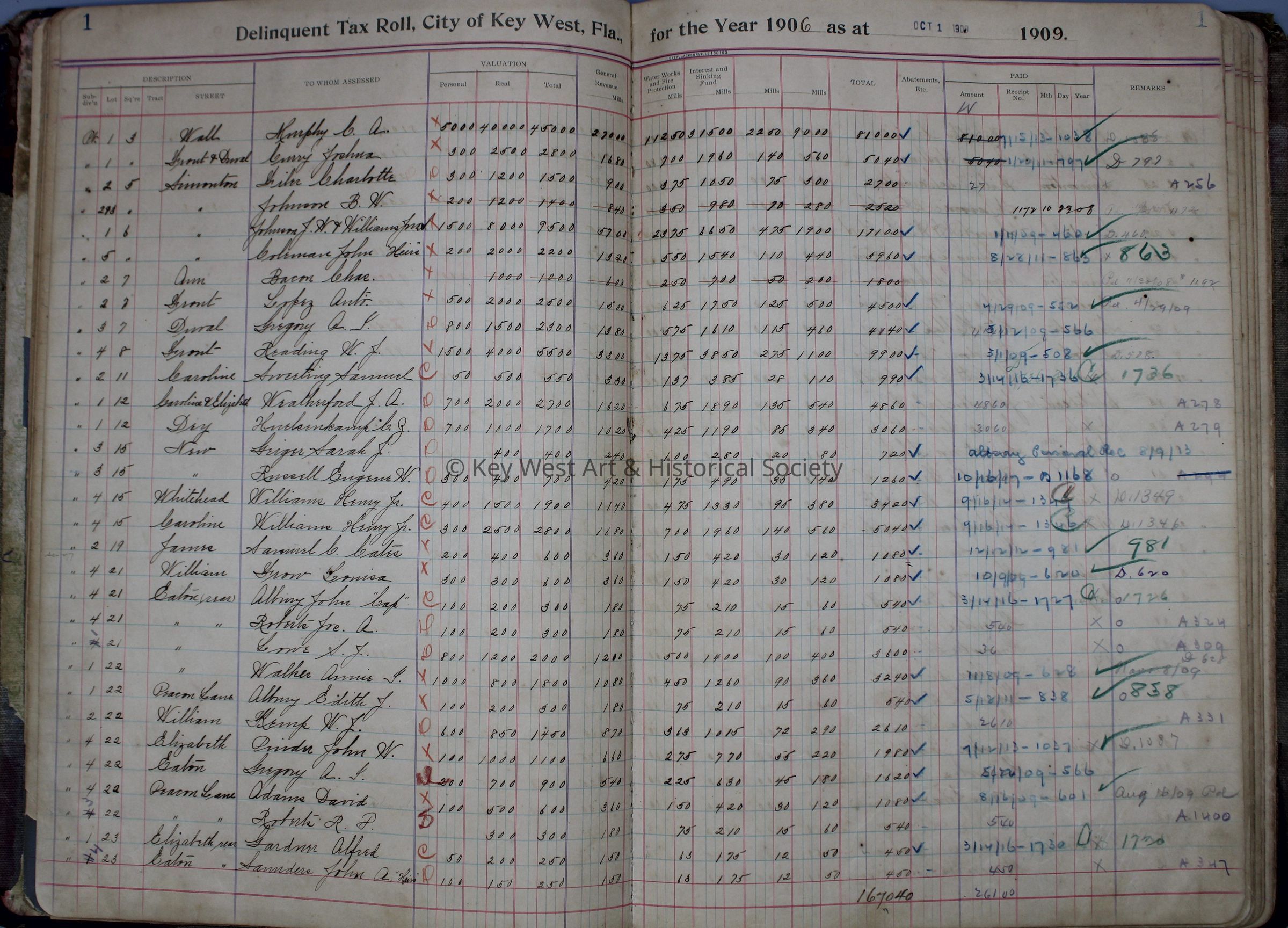 City of Key West Delinquent Tax Roll Year 1906: © Key West Art & Historical Society