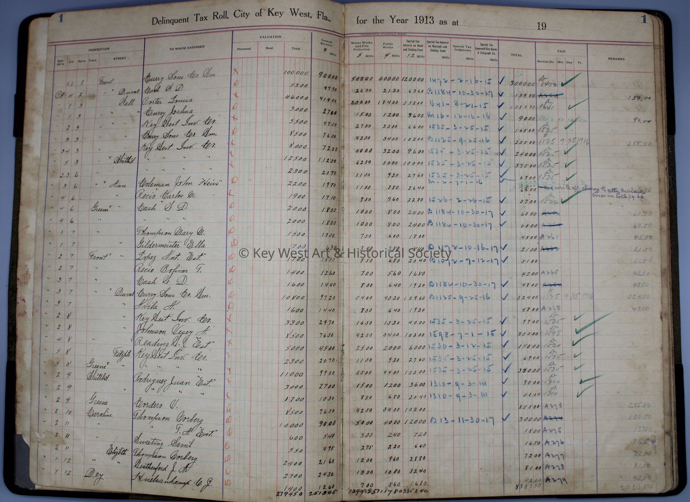 City of Key West Delinquent Tax Roll Year 1913: © Key West Art & Historical Society