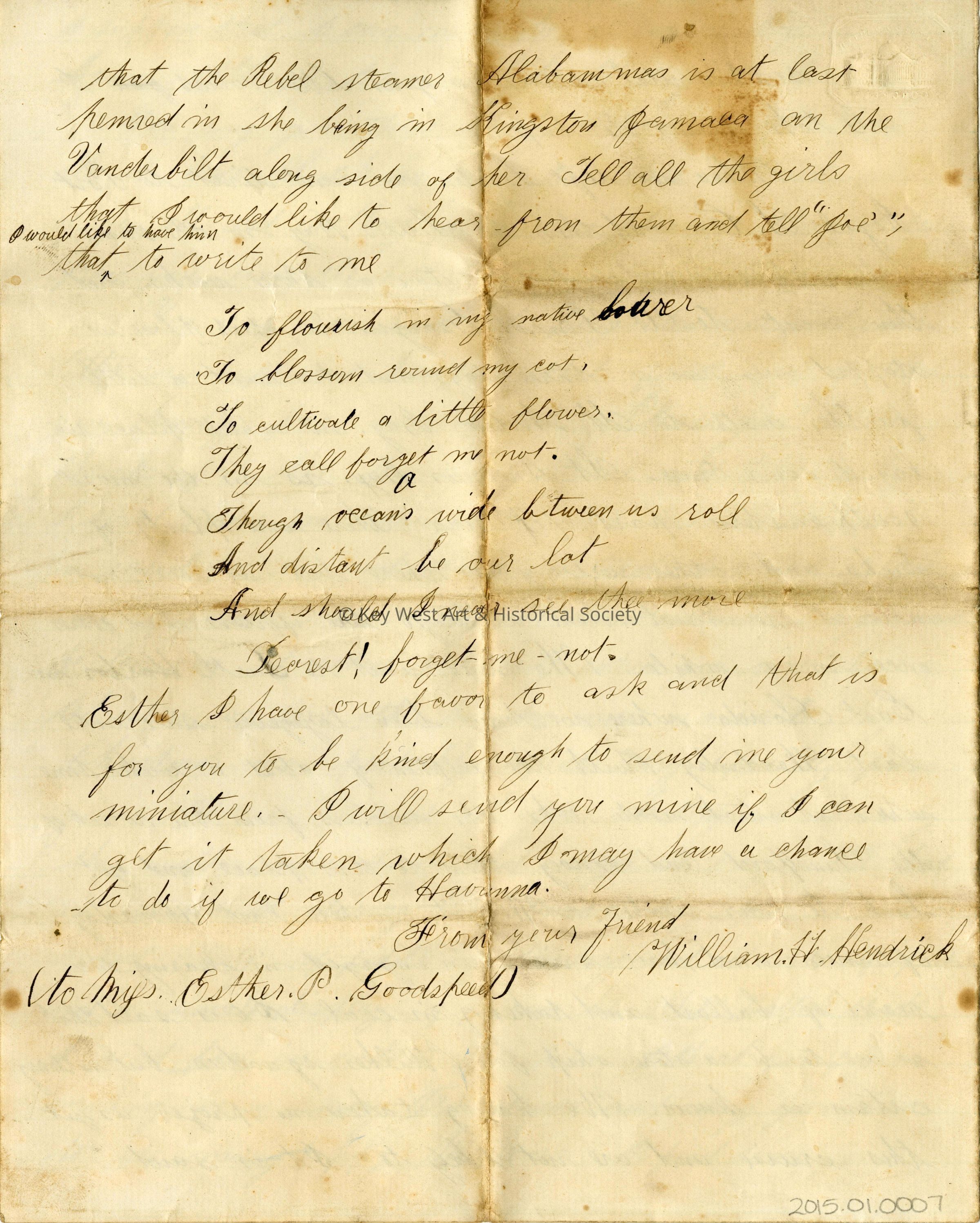 Civil War Letter written on February 4, 1863 aboard U.S. Barque Gemsbok stationed in Key West, Florida. It was written by William H. Hendrick to Miss Esther P. Goodspeed. Transcription of the letter is attached to this record.