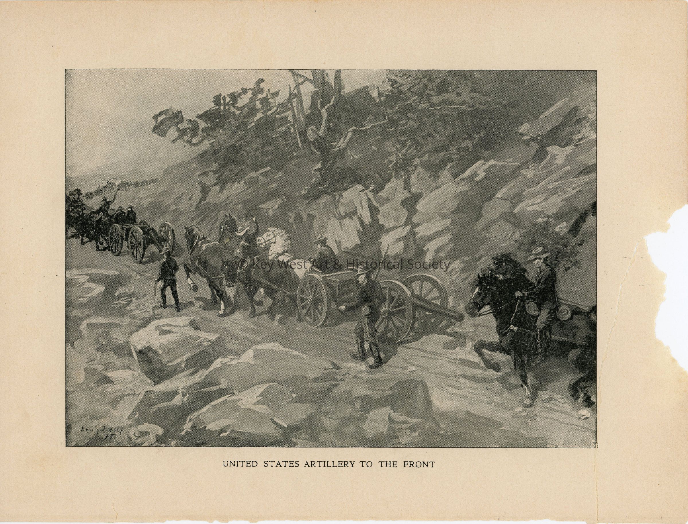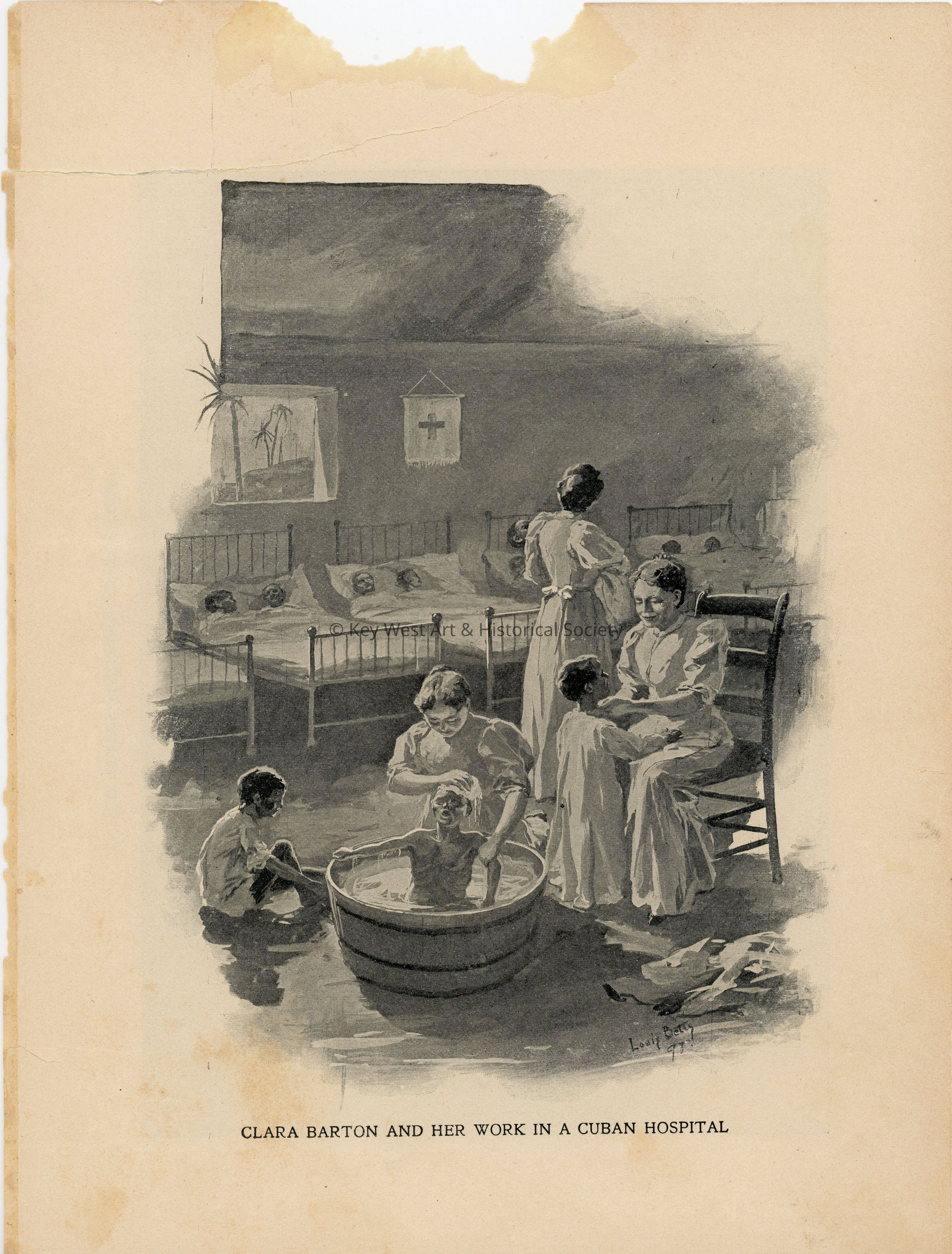 A leaf from an unknown publication with a black and white illustration of Clara Barton working in a Cuban hospital on one side and an illustration of the United States Artillery traveling to the front lines in the Spanish American War. Both illustrations were completed by artist Louis Betts (1873-1961) in 1898.Collection