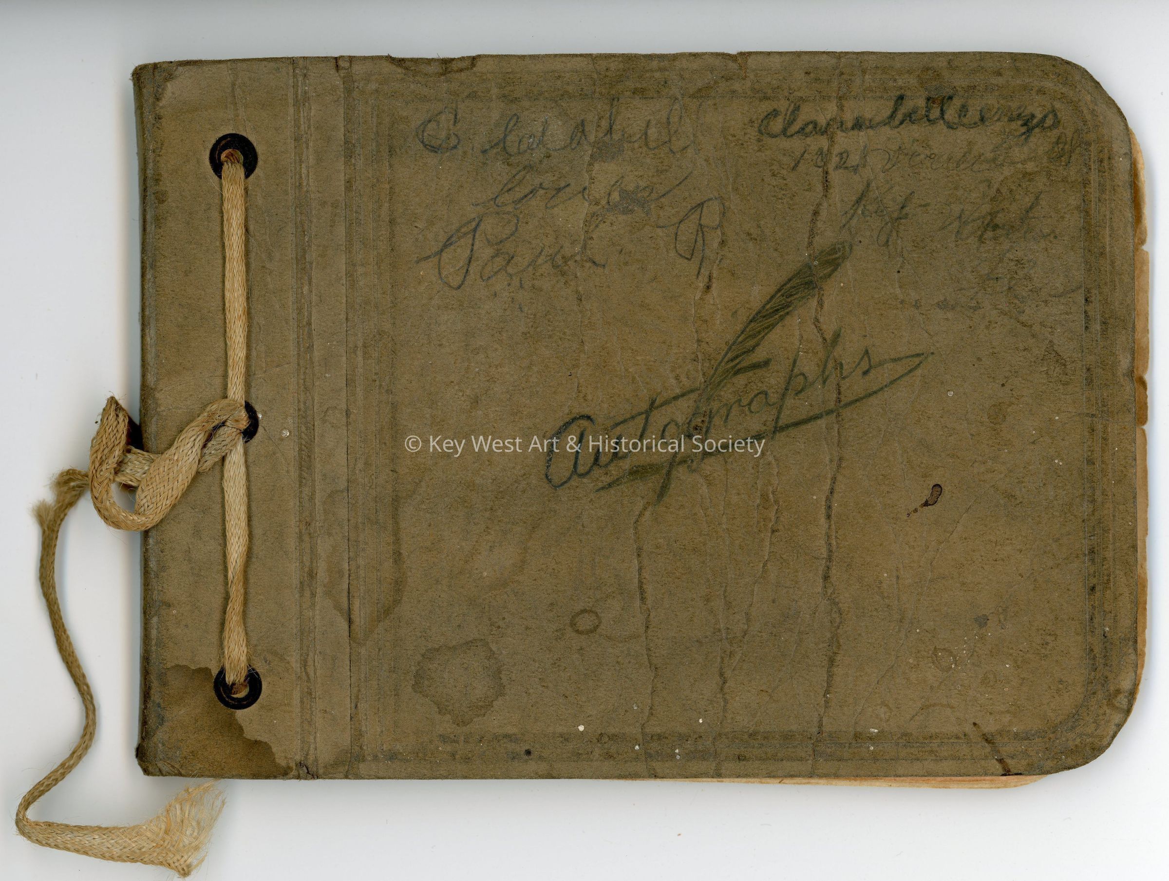 Olive colored cardboard bound book with a shoe lace tie used to bind the pages together. The autograph book was owned by Clarabell Cerezo of 903 Packer Street in Key West. The book has signatures and notes from many young people living in Key West during 1930.