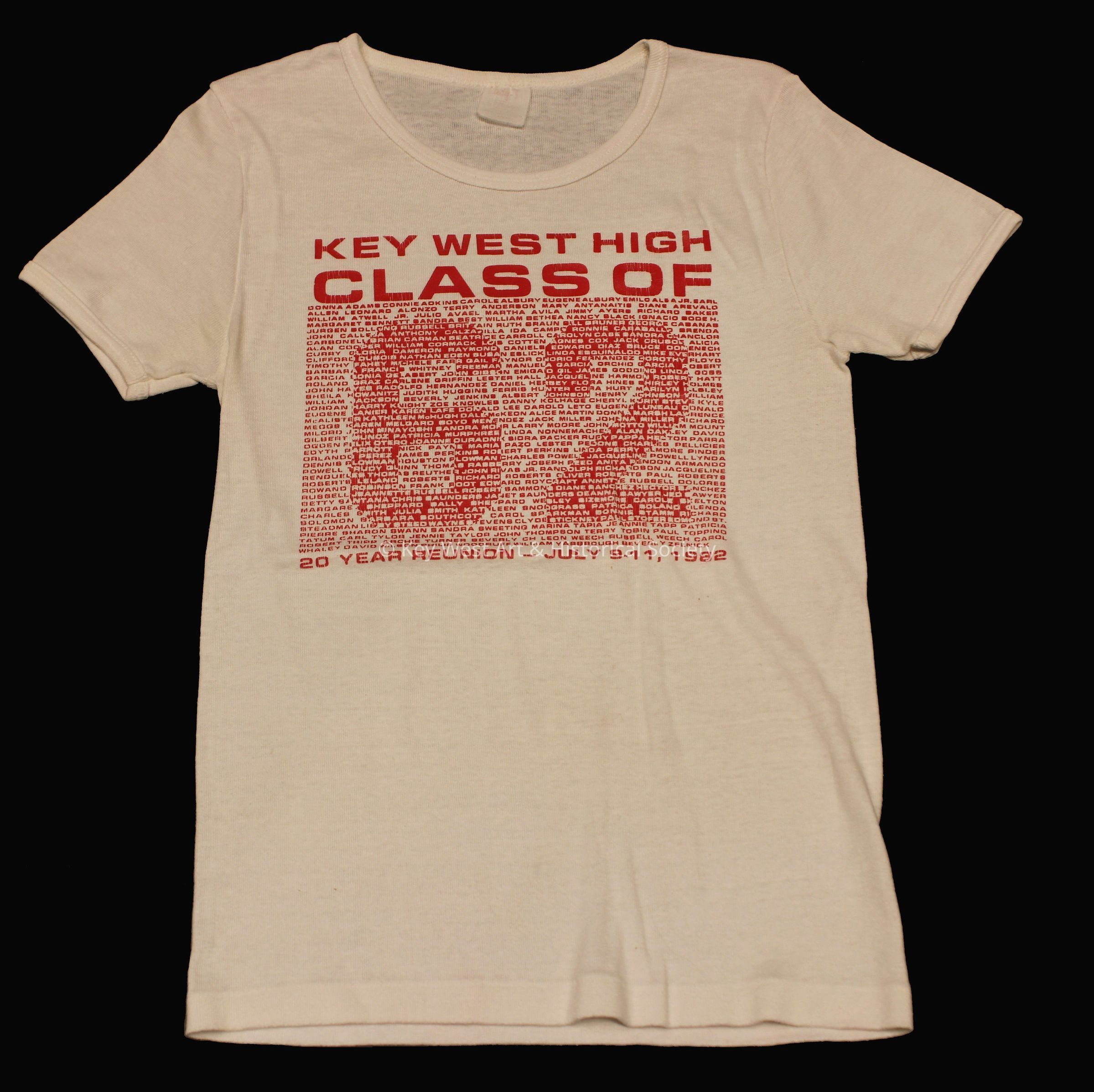 White short sleeved shirt commemorating the twentieth (20th) year reunion of the 'Key West High Class of 62.' The reunion was held on 'July 9-11, 1982.' The shirt includes the names of the members of the Class of 1962.Collection