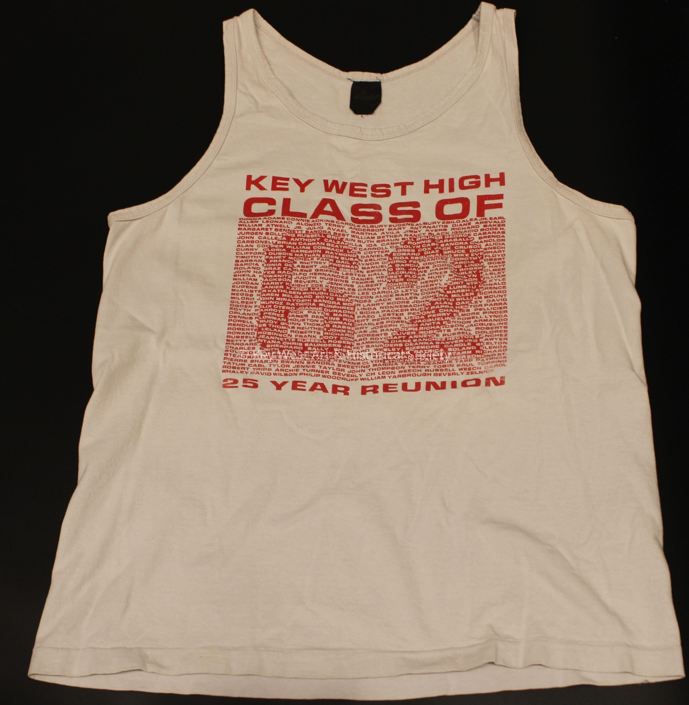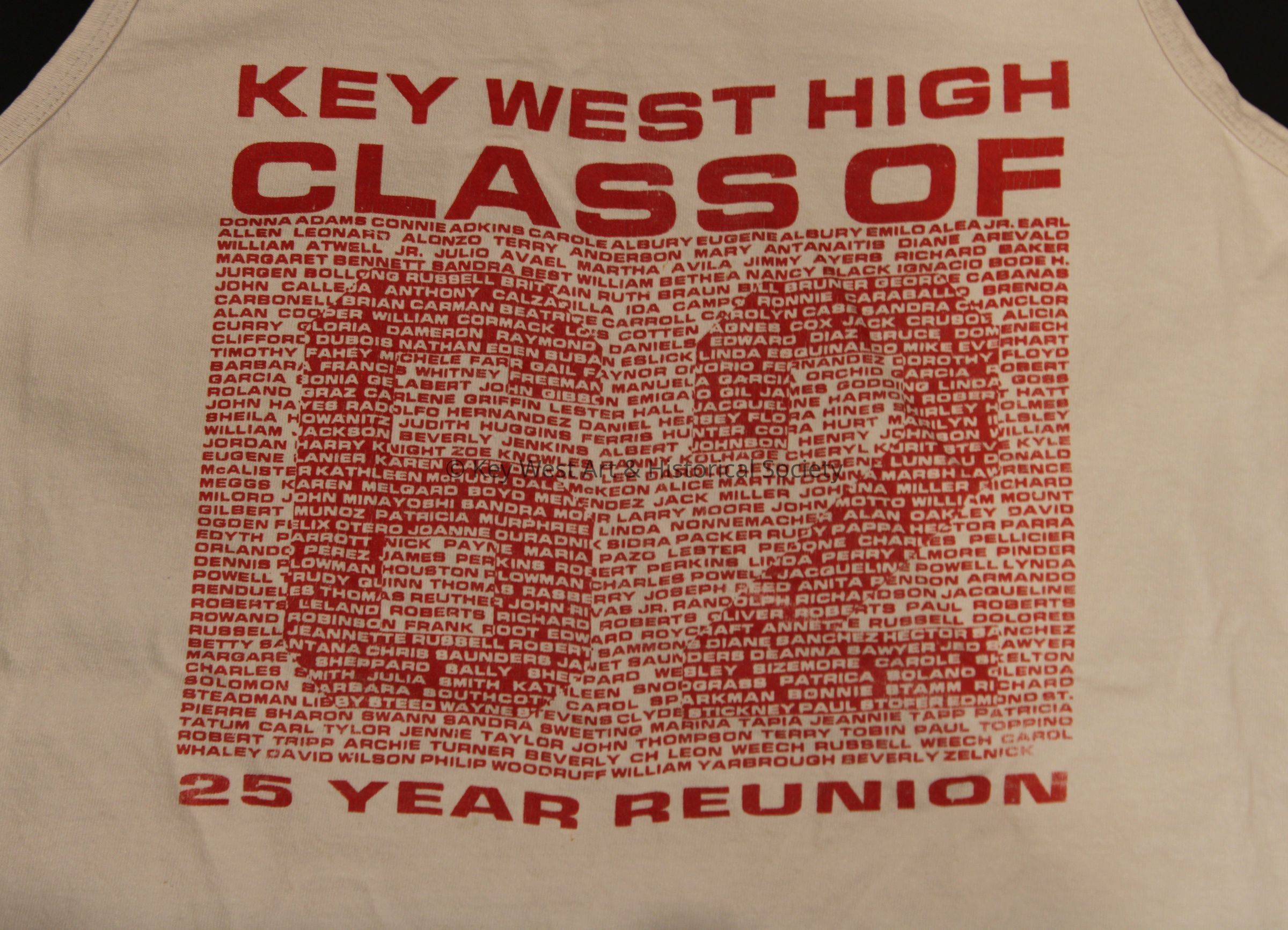 Tank top shirt commemorating the twenty-fifth (25th) year reunion of the 'Key West High Class of 62.' The shirt includes the names of the members of the Class of 1962.