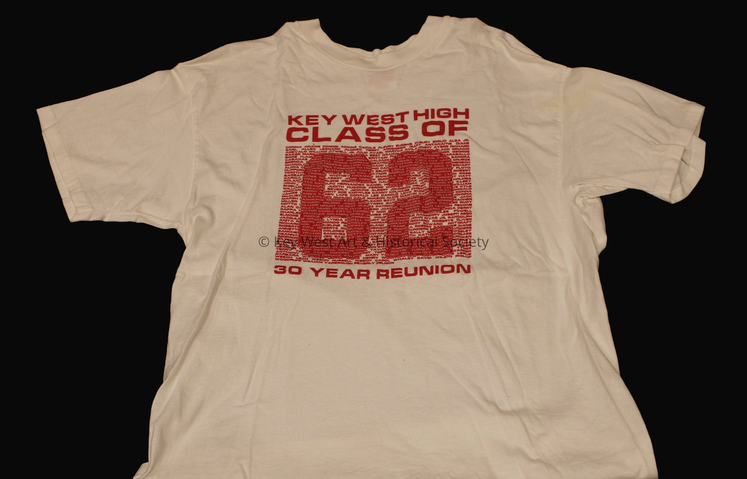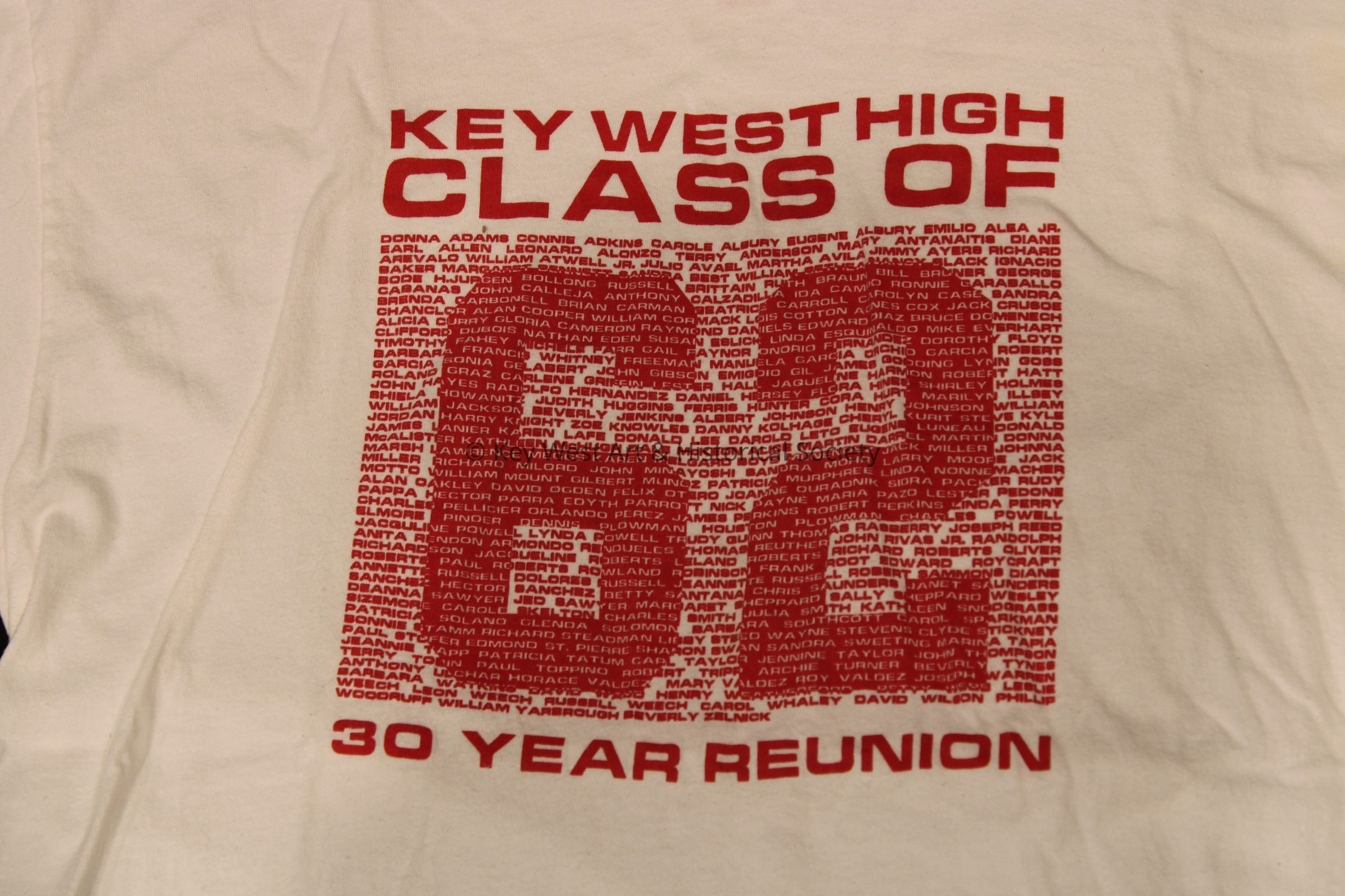 White short sleeved shirt commemorating the thirtieth (30th) year reunion of the 'Key West High Class of 62.' The shirt includes the names of the members of the Class of 1962.