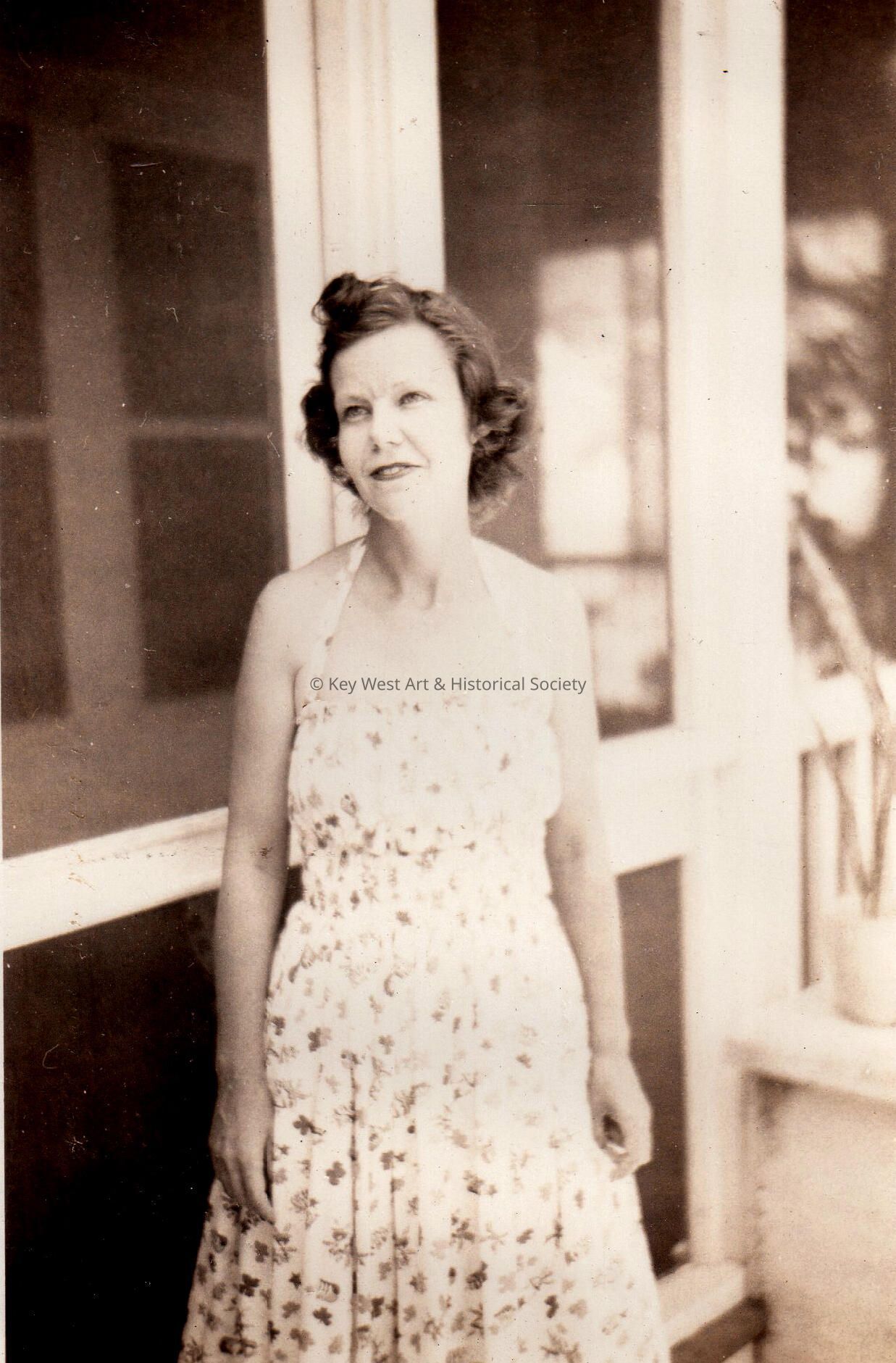 Black and white photograph of Claudia Demeritt Moore, daughter of William Wellesley Demeritt and Claudia A. Albury Demeritt, in sundress on porch of the keeper's quarters of the Key West Lighthouse.