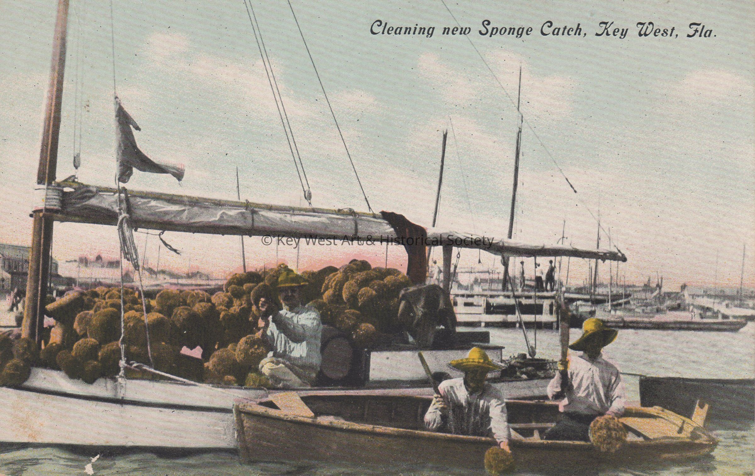 Postcard depicting men on boats with newly-harvested sponges. The caption reads, ‘Cleaning new Sponge Catch, Key West, Florida.’Collection
