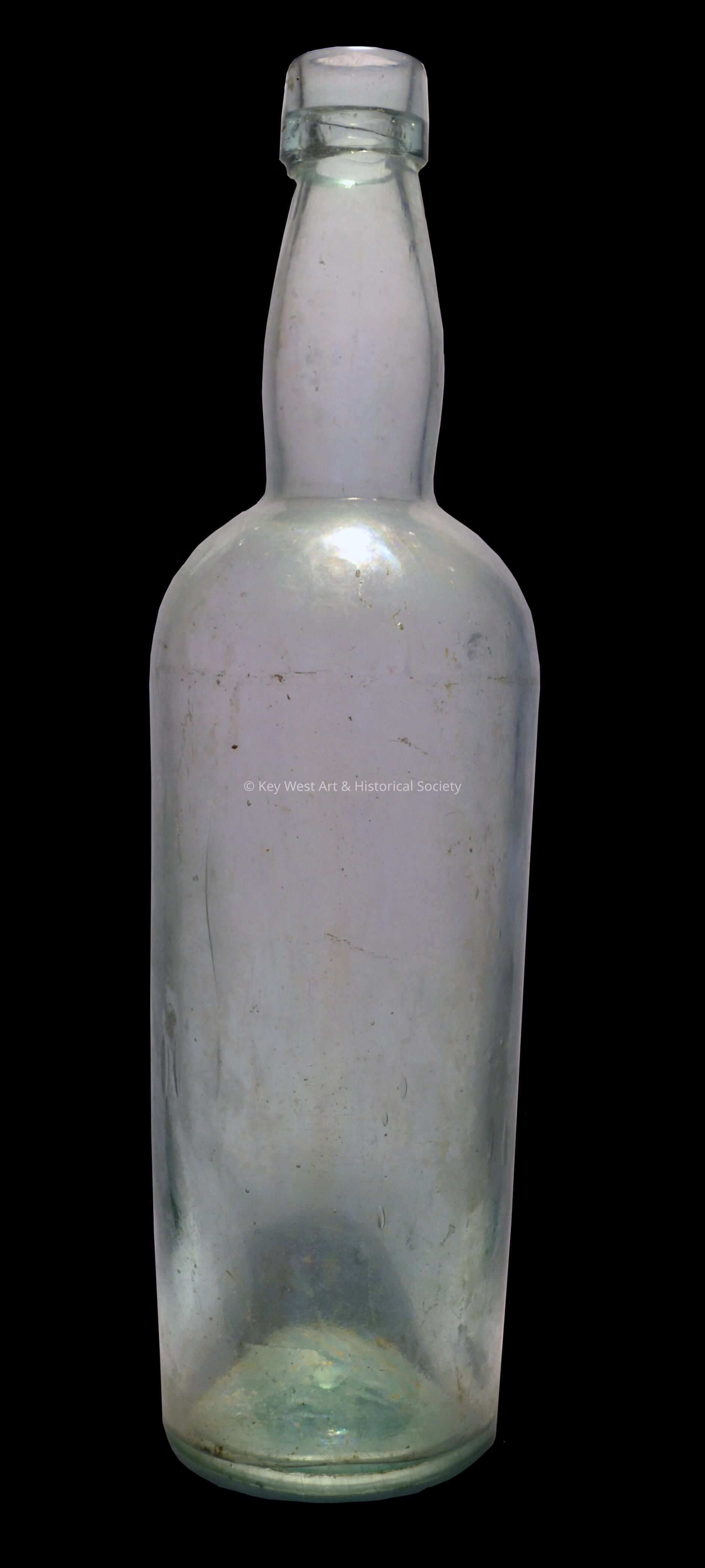 Clear glass alcohol bottle with no embossing and no top. The bottle was originally excavated by the donor's mother, Grace Curlee, during the restoration of Fort Zachary Taylor in the 1960s.Collection