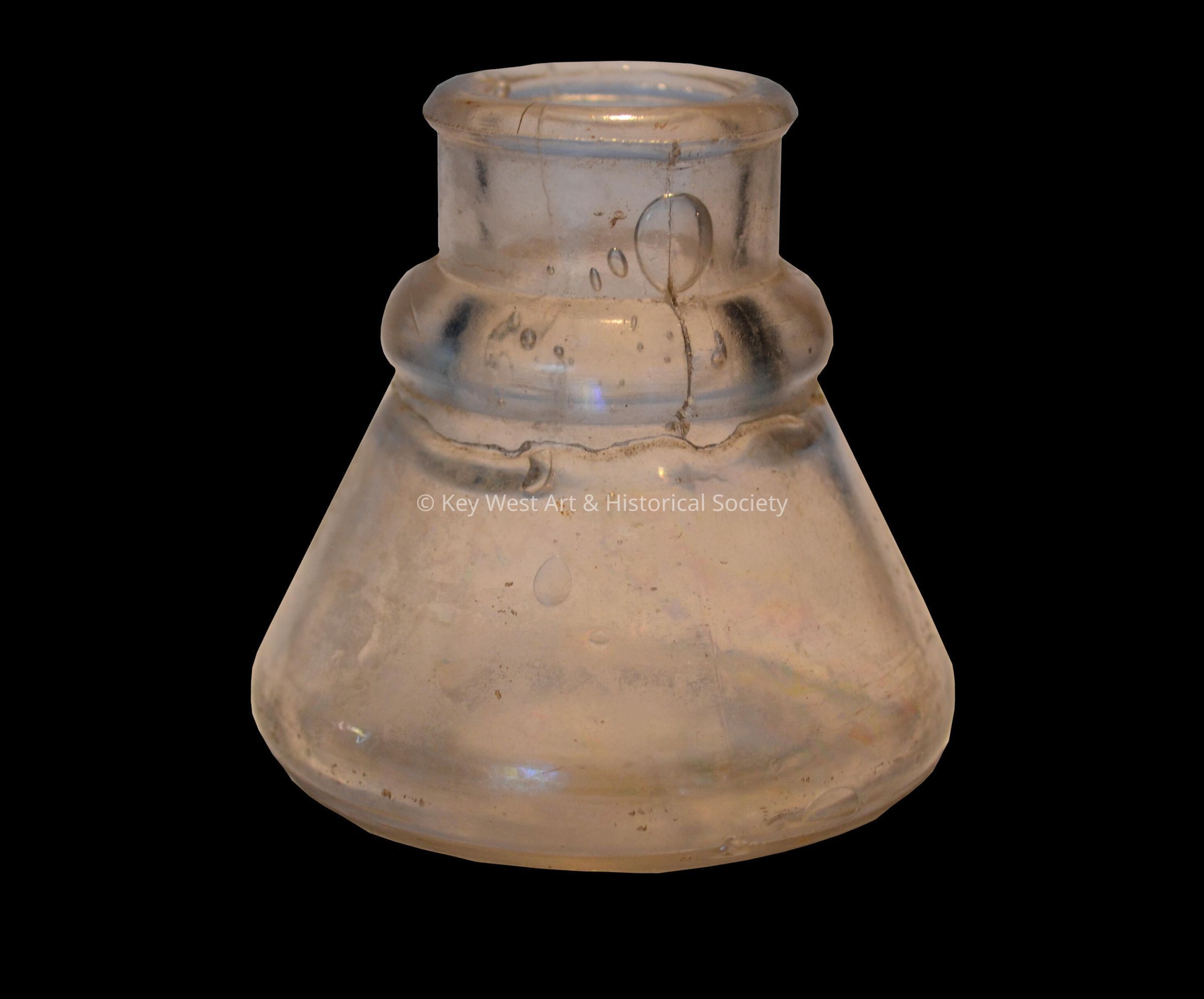 Clear glass ink bottle with no embossing and no top. The bottle was originally excavated by the donor's mother, Grace Curlee, during the restoration of Fort Zachary Taylor in the 1960s.Collection