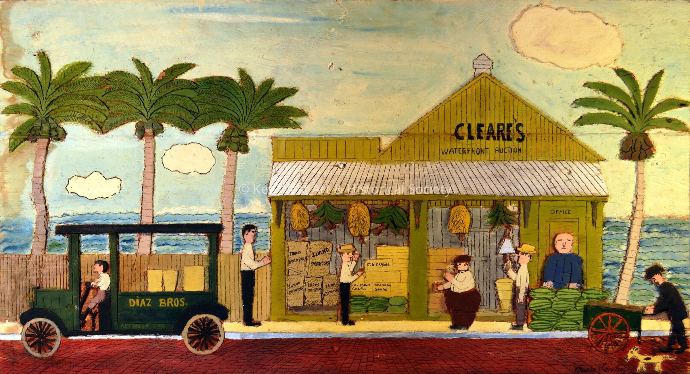Wood carving by Mario Sanchez depicting Cleare's Waterfront Auction. Customers are purchasing produce while a Diaz Bros. truck is out front.Type of Sculpture
