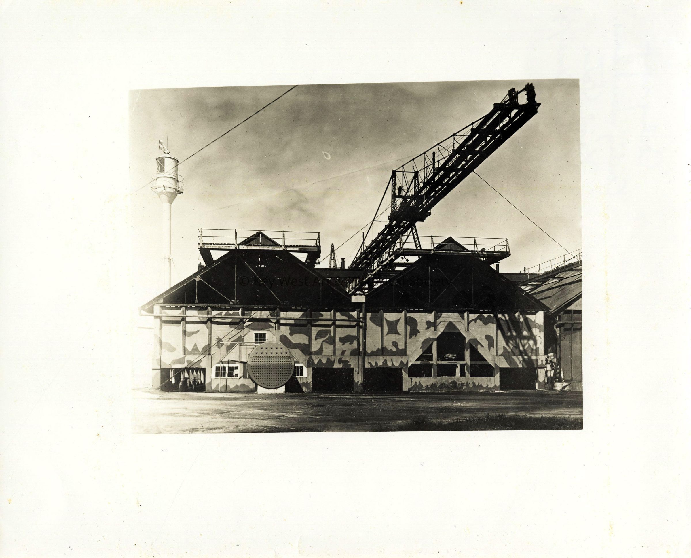 Black and white photograph of the coaling rig and coaling warehouse at Key West Naval Station displaying World War I camouflage.