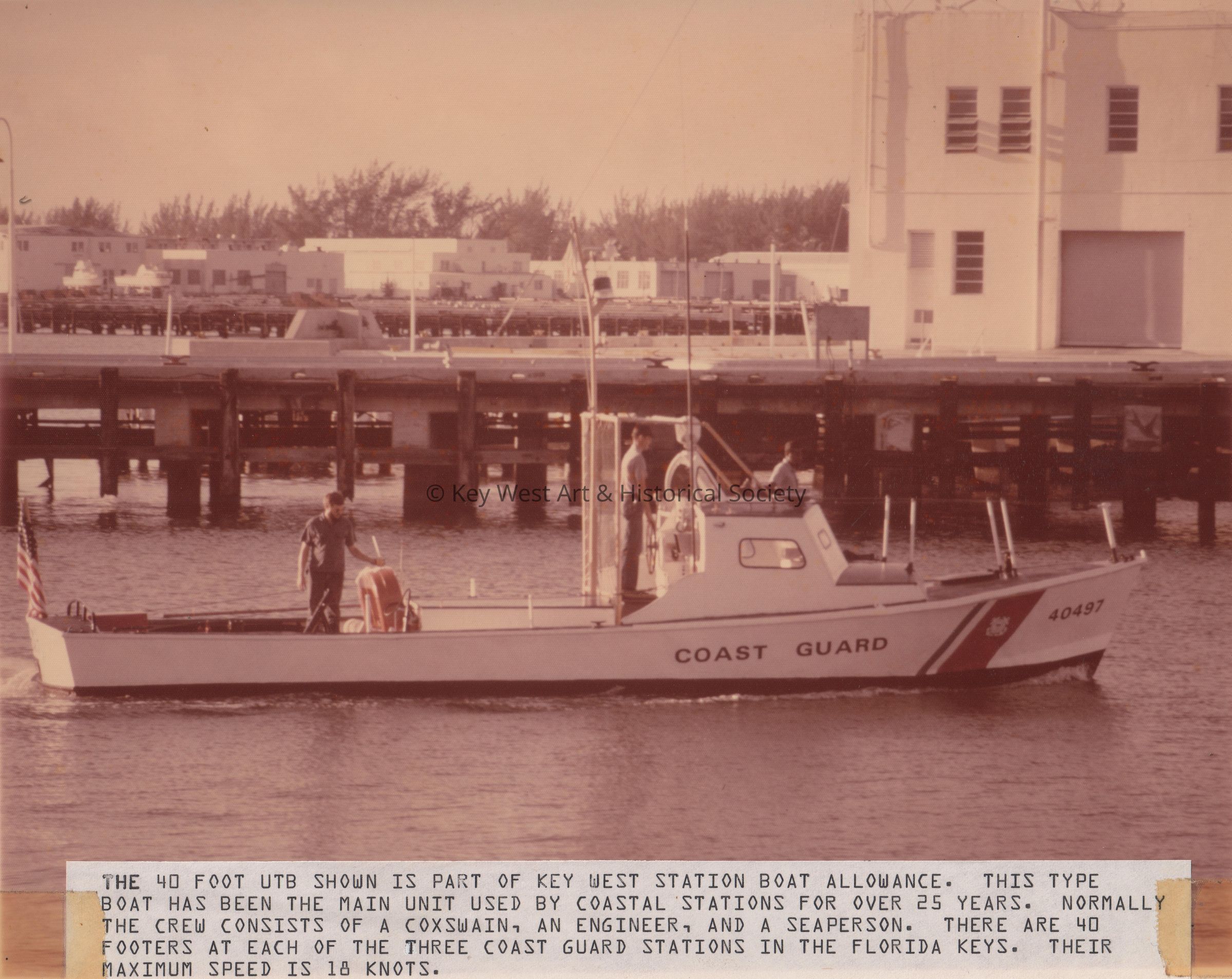 CG-40497 is the 40-foot UTB at the Key West Coast Guard station. Normally the crew consists of a coxswain, an engineer, and a seaperson, and their maximum speed is 18 knots. There were 40 footers at each of the coast guard stations in the Florida Keys.Collection