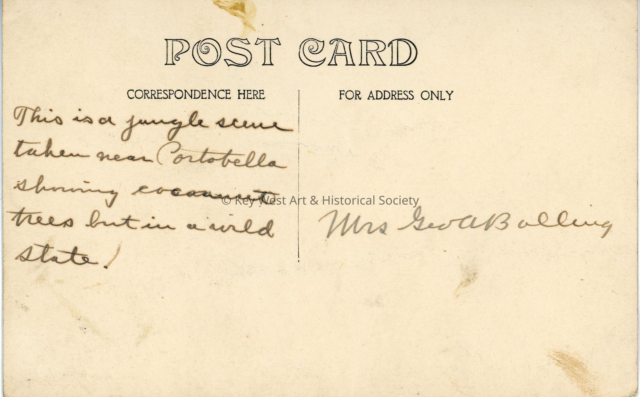 Black and white photograph postcard depicting coconut trees in the jungle near Portobelo. The postcard is addressed to Mrs. Geo. A. Balling. Verso has a handwritten note.Subject