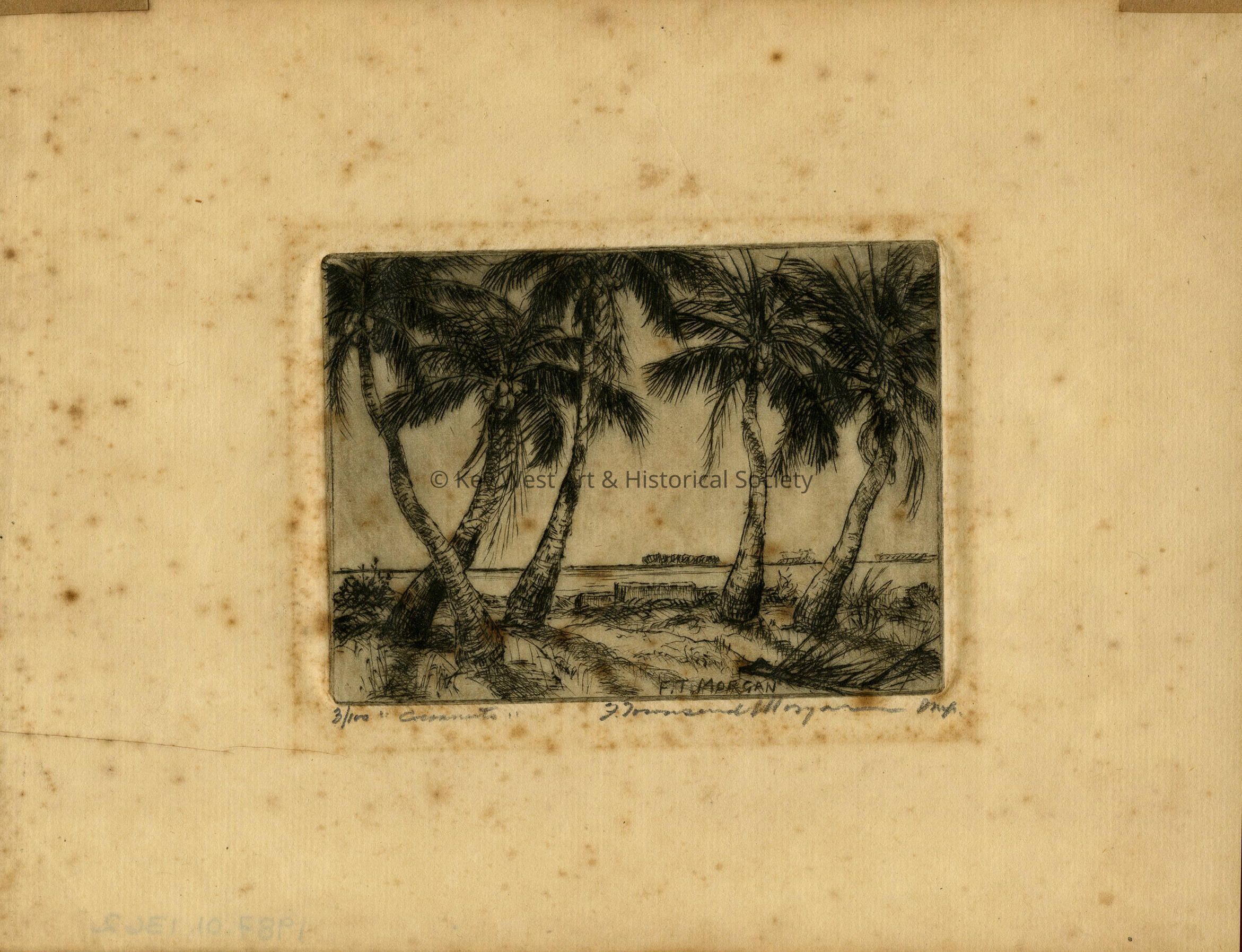 Etching by F. Townsend Morgan of palm trees with coconuts on a beach. Numbered 3/100.