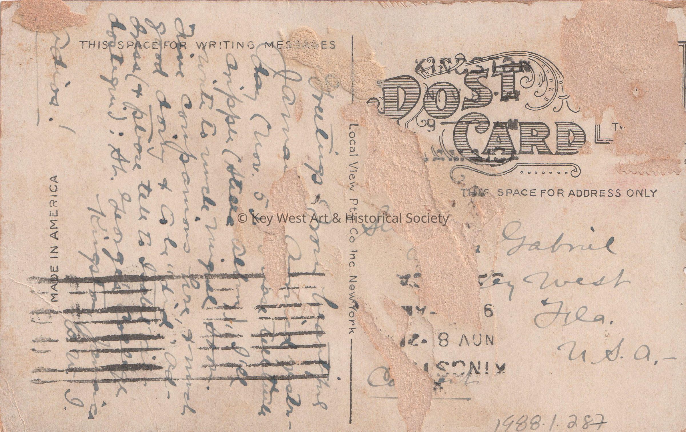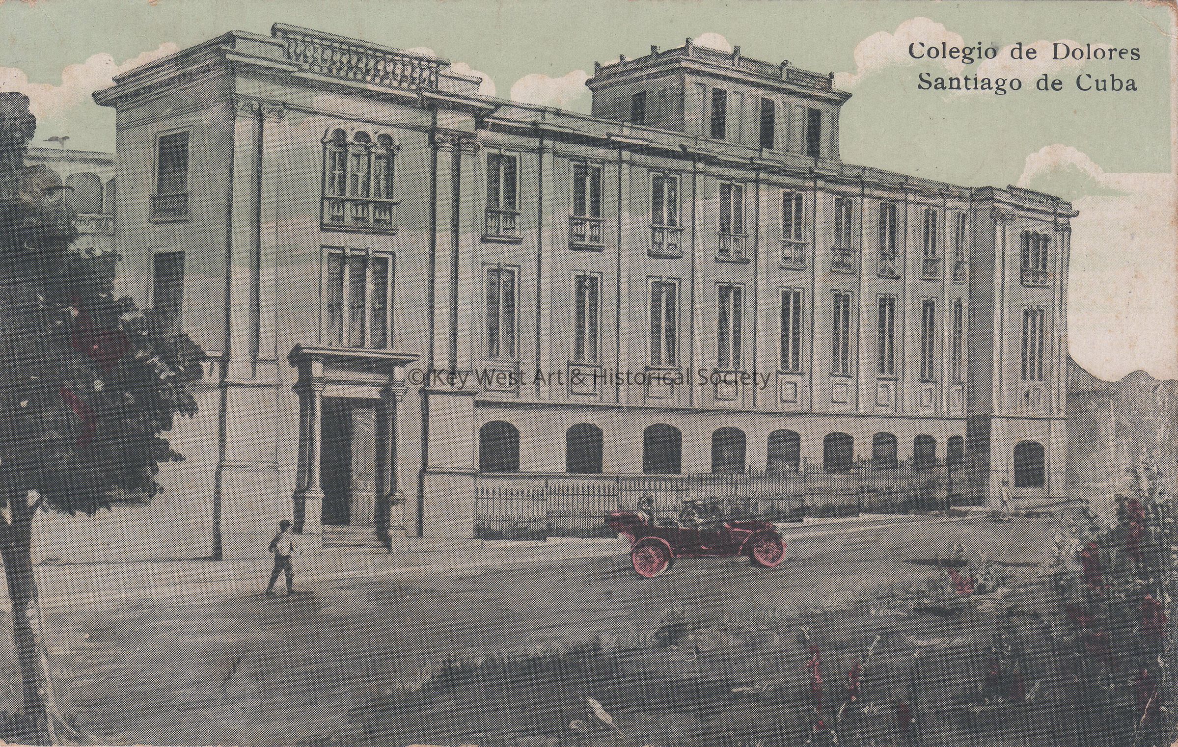 Postcard depicting a car in front of a large building. The caption reads, ‘Colegio de Dolores Santiago de Cuba.’ The message on the verso reads, ‘Greetings from beautiful Jamaica, arrived yesterday (November 5) __ cripple sticks __. I’ll write to Uncle Miguel soon. Five companions here and much good doing (Address and phone to Isabel, St. George College, Kingston, Jamaica.) Adios!’ The postcard is addressed to Sister Gabriel, Key West Convent.Subject Place