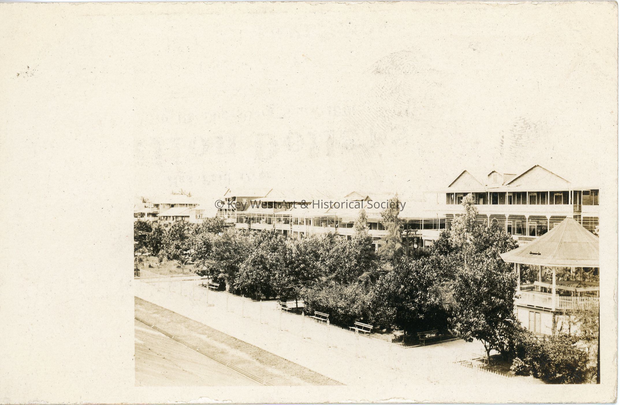 Black and white photograph postcard depicting a park with housing behind it in Colon. The park was located close to the Panama Railroad Depot. Verso has a handwritten note.Subject