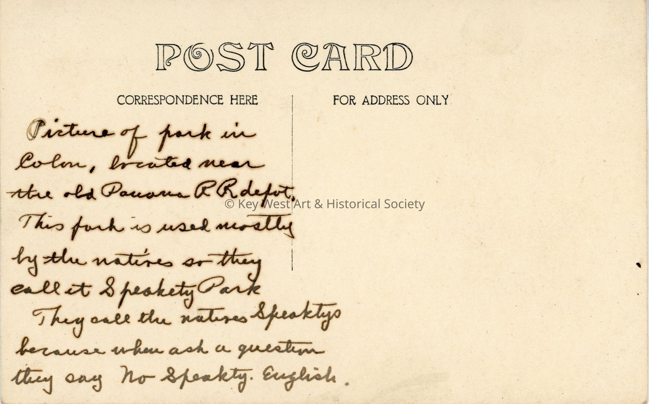 Picture of park in Colon, located near the old Panama R.R. depot. This park is used mostly by the natives so they call it Speakety Park. They call the natives Speaktys because when ask a question they say no speakty English.Language
