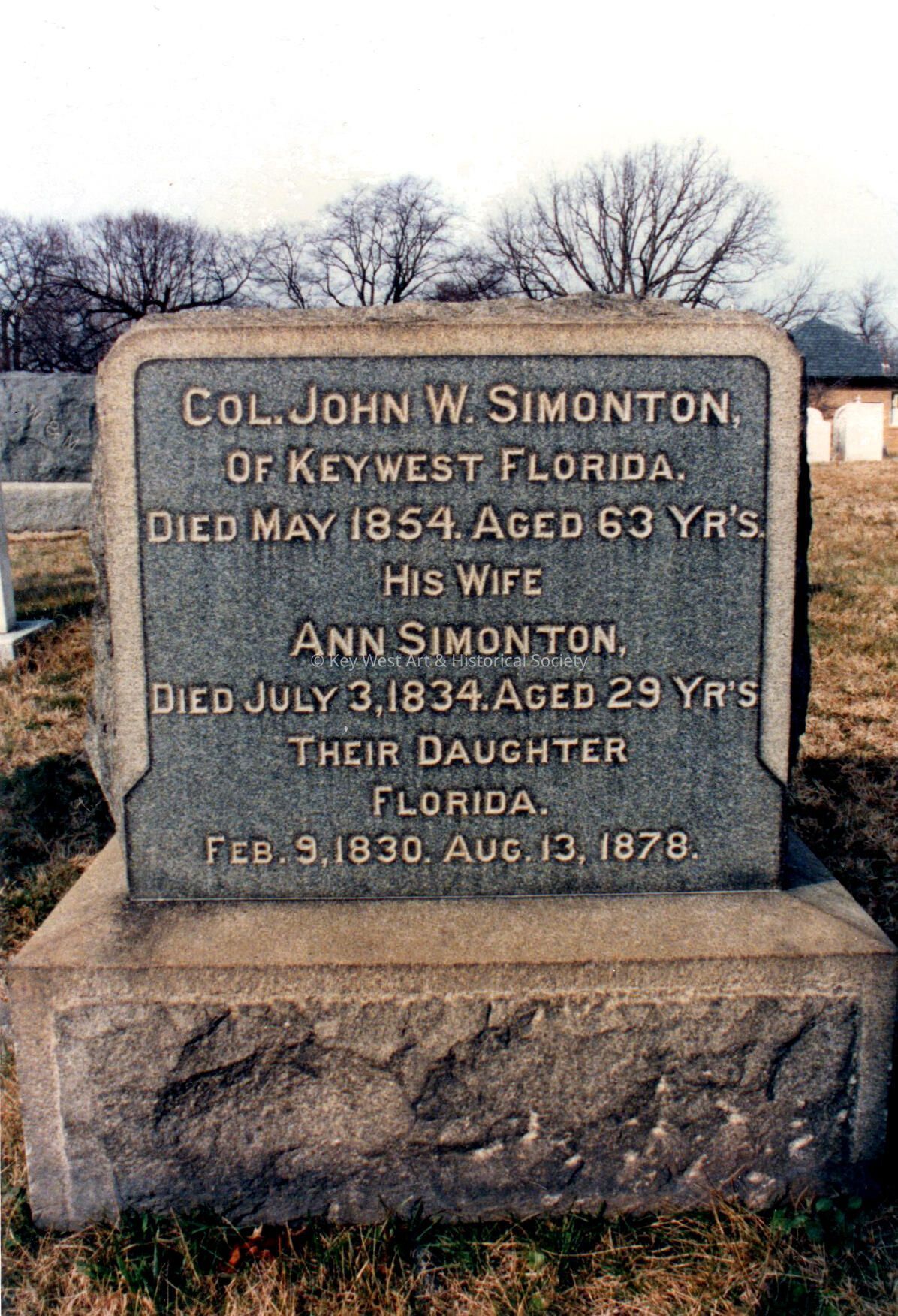 Color photograph of Colonel John W. Simonton's headstone at the Congressional Cemetery in Washington, D.C. Simonton was the original purchaser of Key West. Buried with him are his wife Ann Simonton and their daughter, Florida.Collection