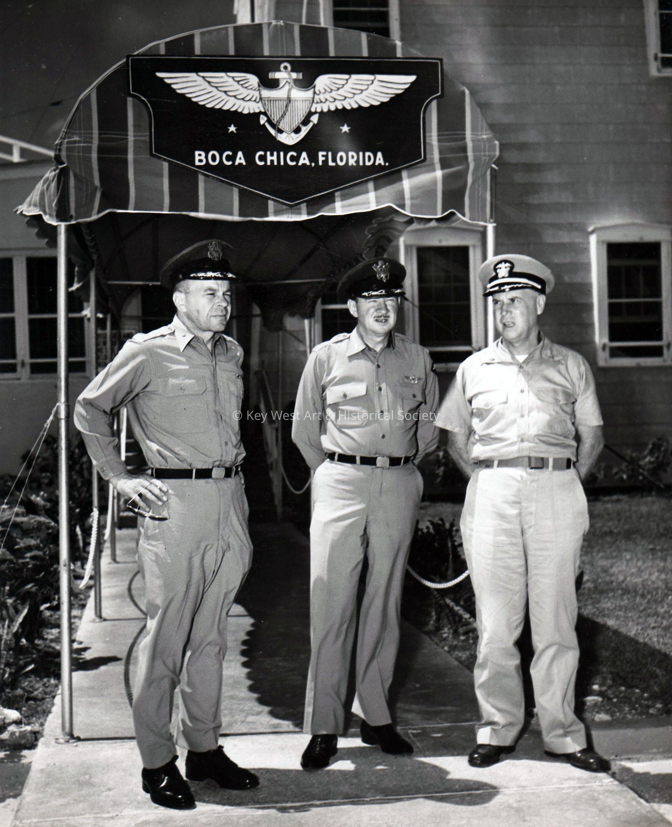 Black and white photograph of Colonel M.N. McCar, U.S.A.F., Brigadier General J.E. Briggs, U.S.A.F. and Captain C.C. Adell, U.S.N. and Commander of Naval Air Station Key West at Boca Chica.Photograph Details