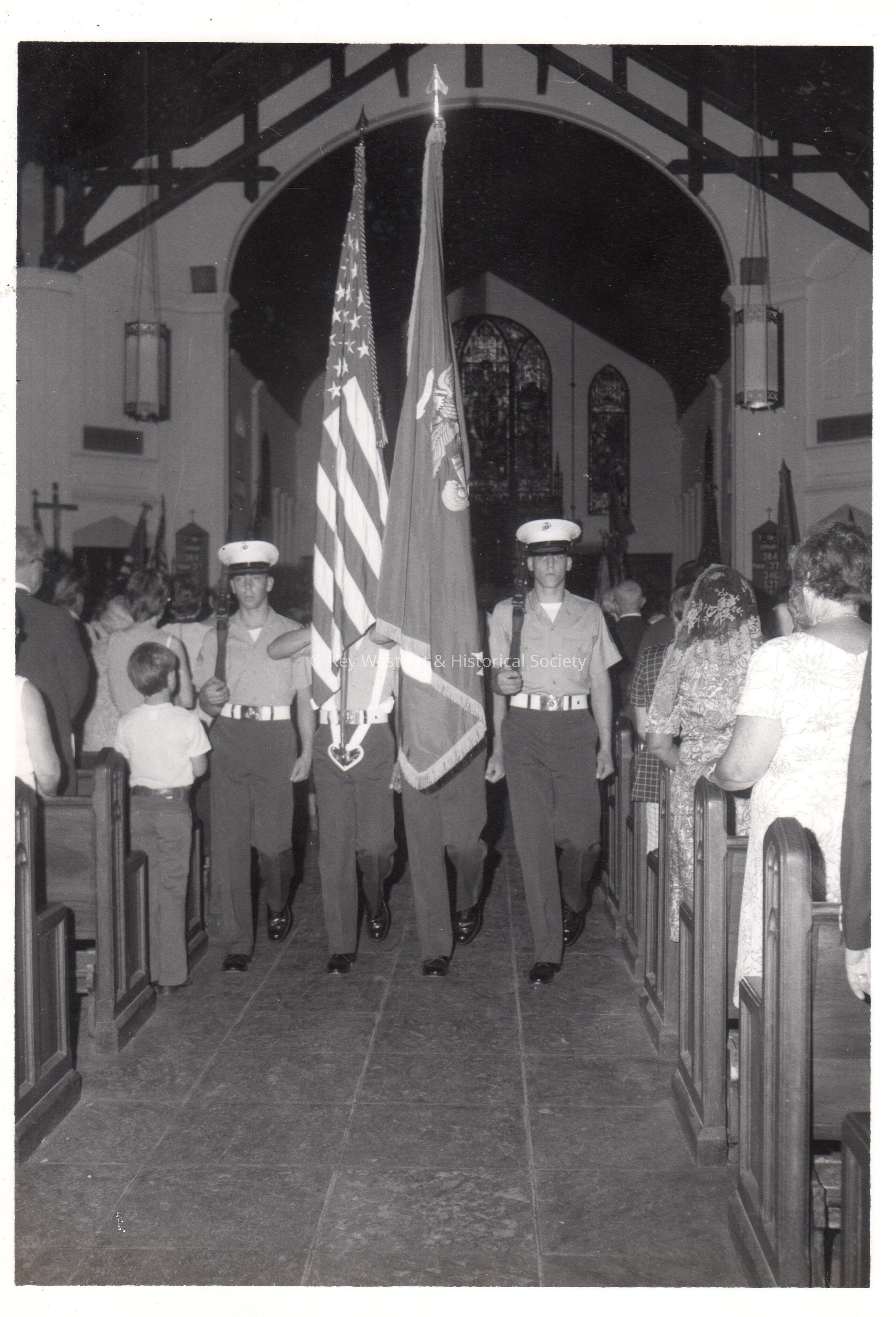 Black and white photograph of the U.S. Navy Color Guard inside St. Paul's Episcopal Church at 401 Duval Street.