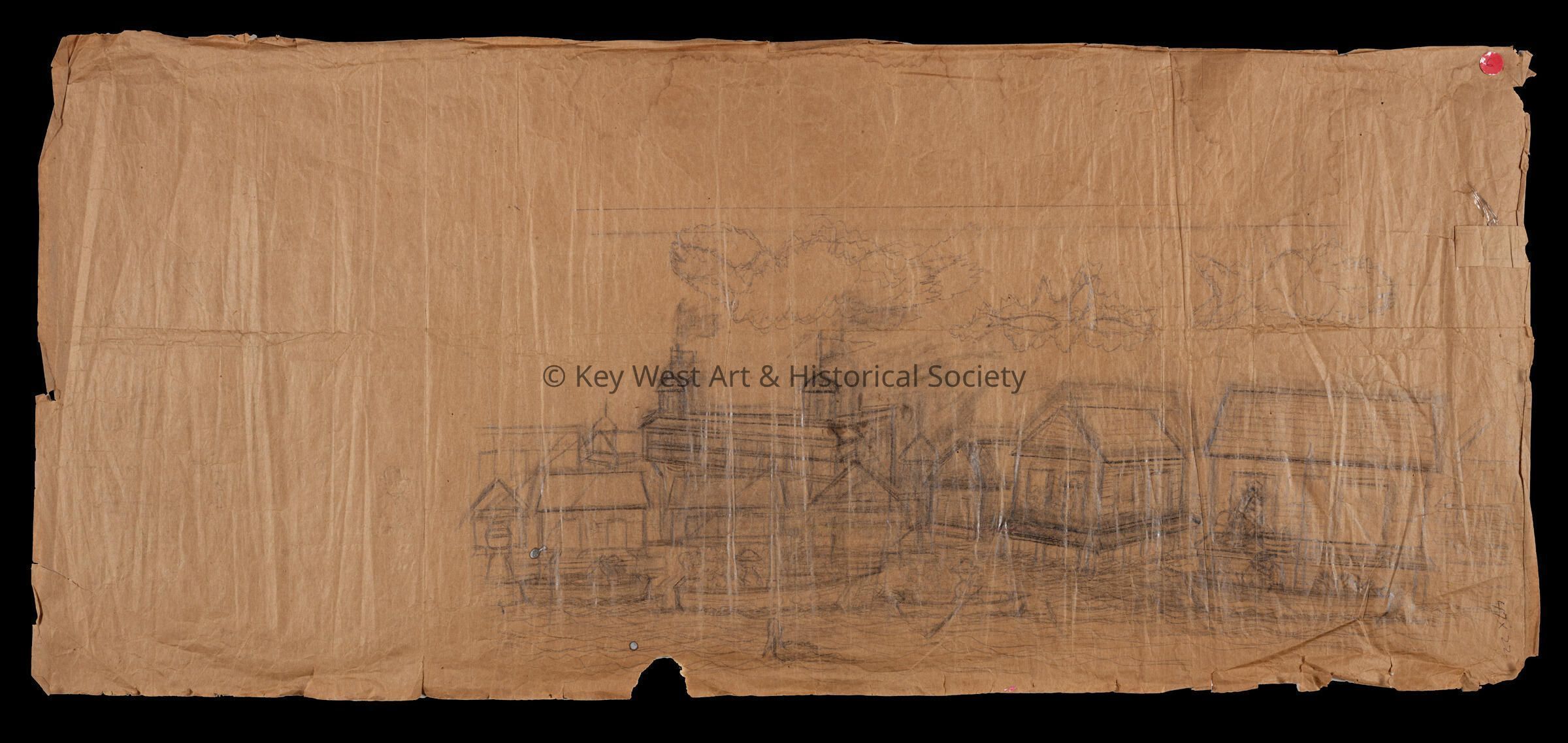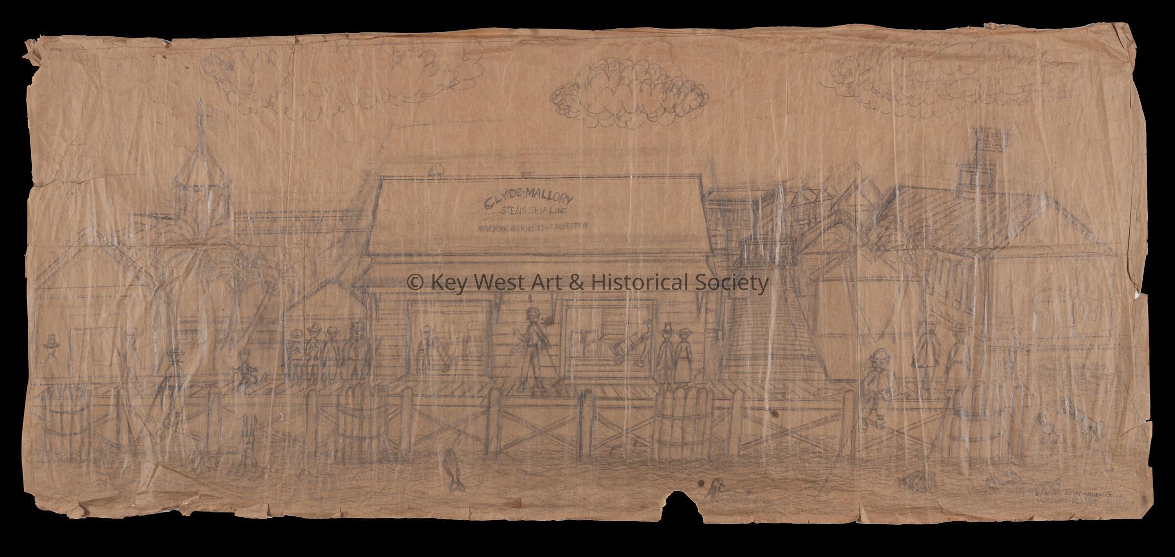 Pencil sketch on an unfolded paper bag by Mario Sanchez depicting the Clyde Mallory Steamship Line. There is another sketch on the verso depicting the Curry & Sons Chandlery and the Key West Bight.Type of Drawing
