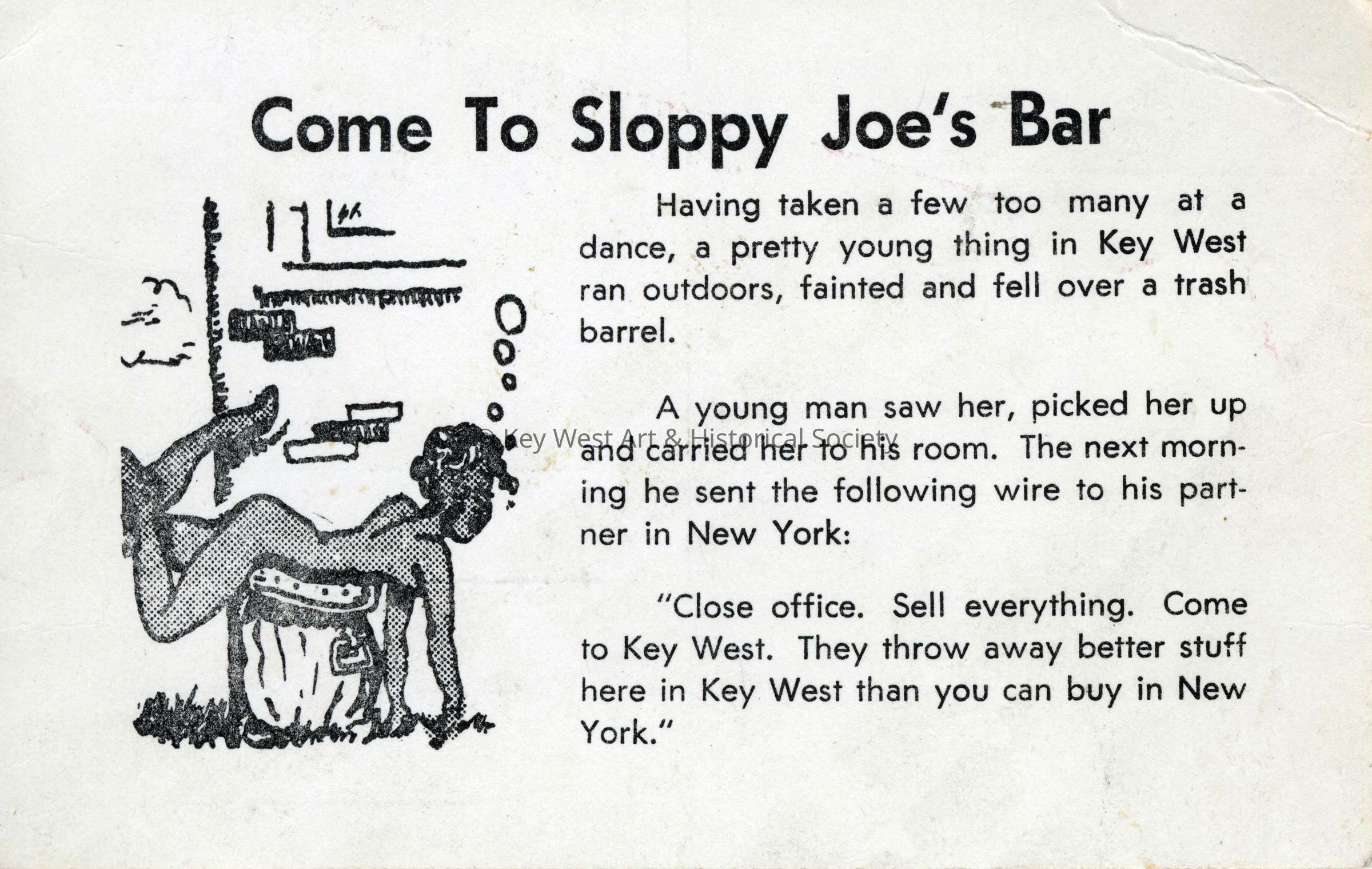 Postcard from Sloppy Joe's Bar depicting a woman over a trash can. The text reads, 'Having taken a few too many at a dance, a pretty young thing in Key West ran outdoors, fainted and fell over a trash barrel. A young man saw her, picked her up and carried her to his room. The next morning he sent the following wire to his partner in New York: 'Close office. Sell everything. Come to Key West. They throw away better stuff here in Key West than you can buy in New York.'' The description on the verso reads, ‘Many “Hellos” from the original Sloppy Joe’s Bar, Key West, Florida.’Subject Person/Organization