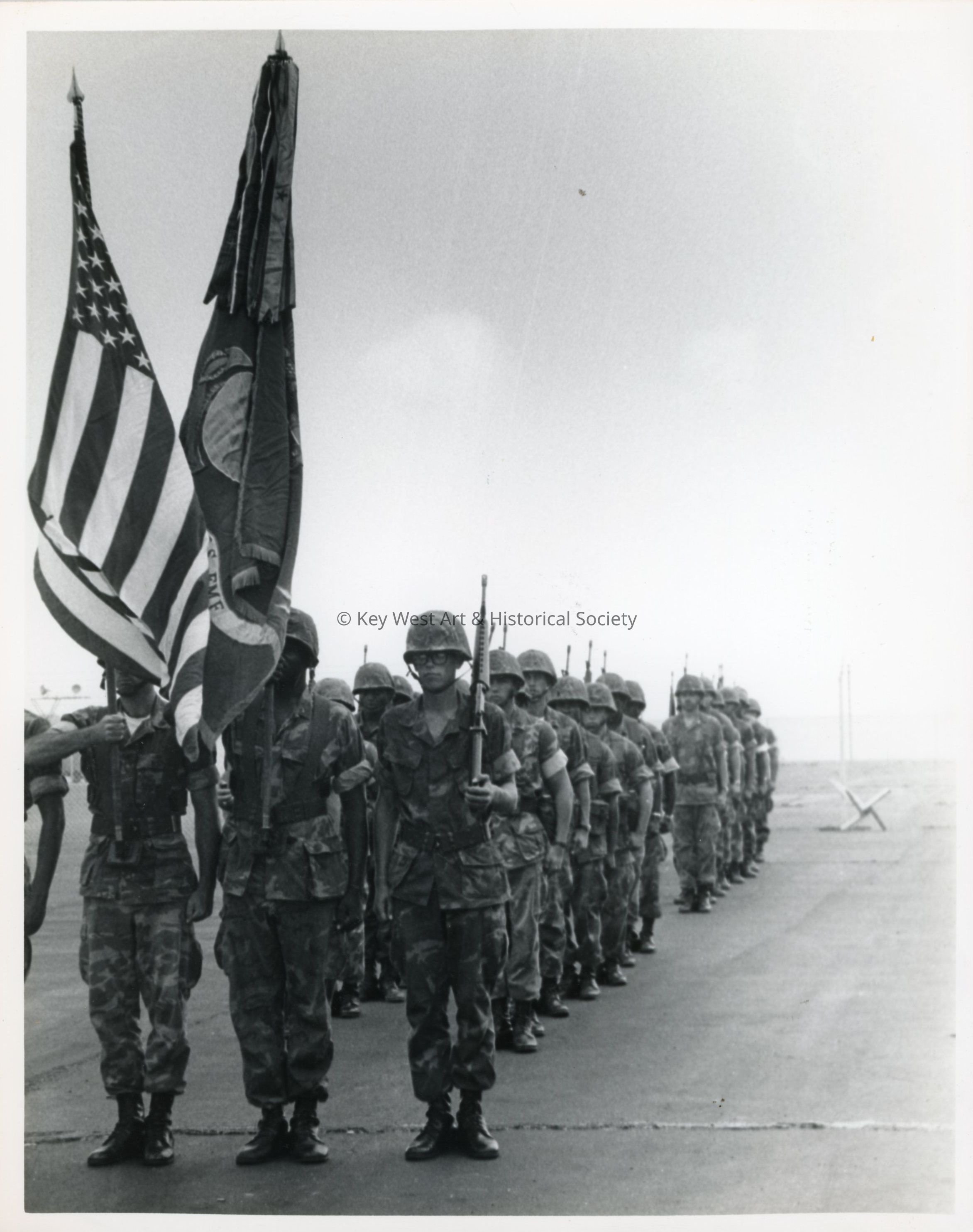 Black and white photograph of U.S. Marines from Camp Lejeune, NC, await command pass at Trumbo Point Annex.