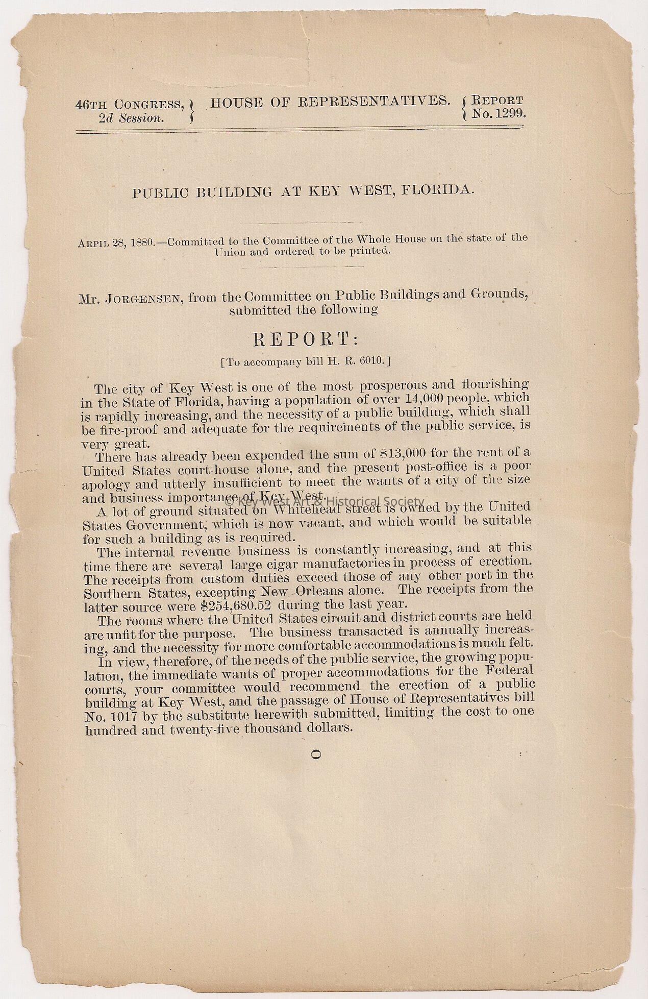 Report requesting that a piece of government land on Whitehead be used for the new public building in Key West. Key West is a flourishing city and the current government buildings are not suitable.Collection
