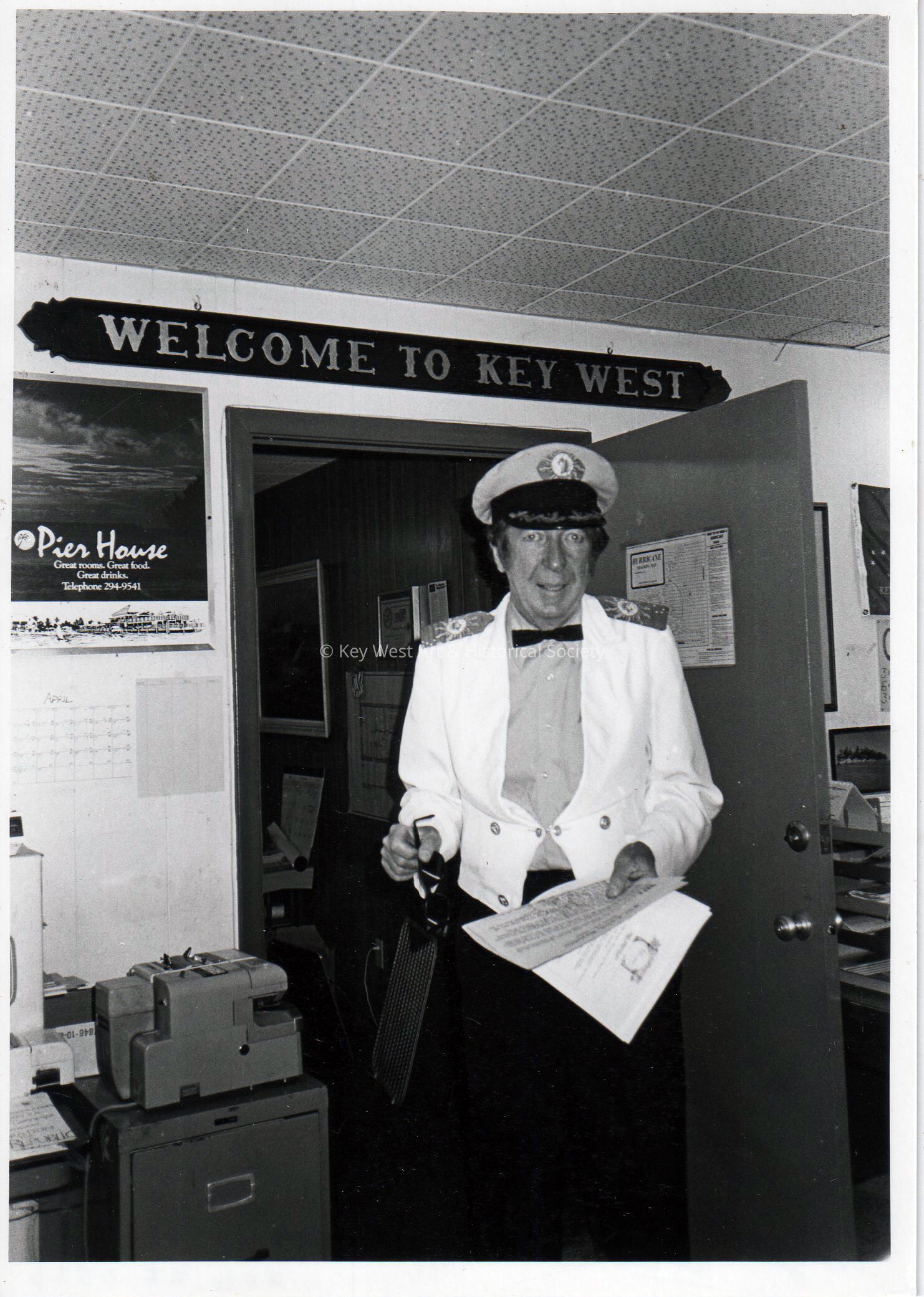 Black and white photograph of John Hannah, director of the Key West Chamber of Commerce, during the third annual Conch Republic Days Celebration.