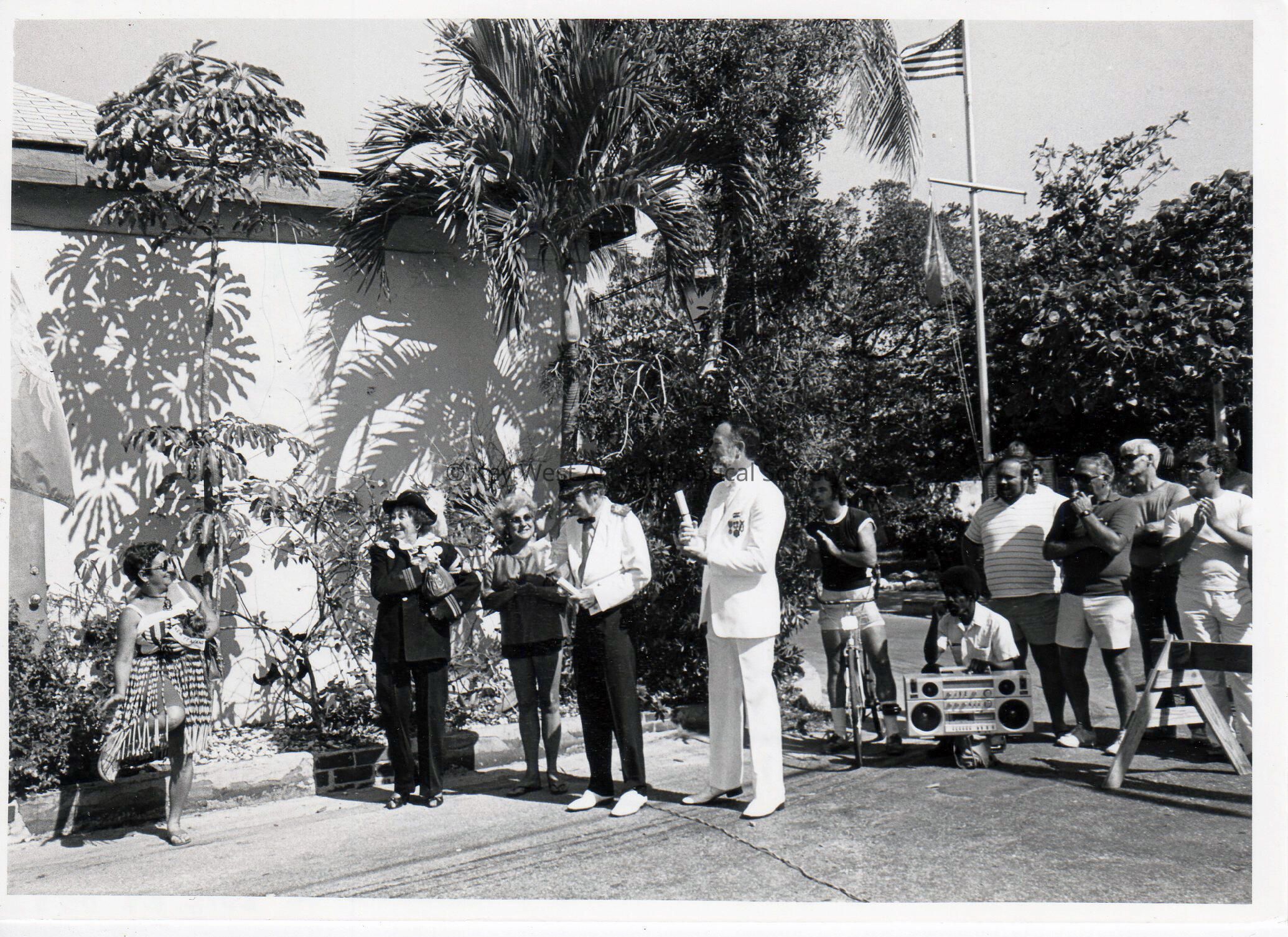 Black and white photograph of (l-r) Mayor Wilhelmina Harvey, John Hannah, and Key West Mayor Richard Heyman during the third annual Conch Republic Days Celebration.