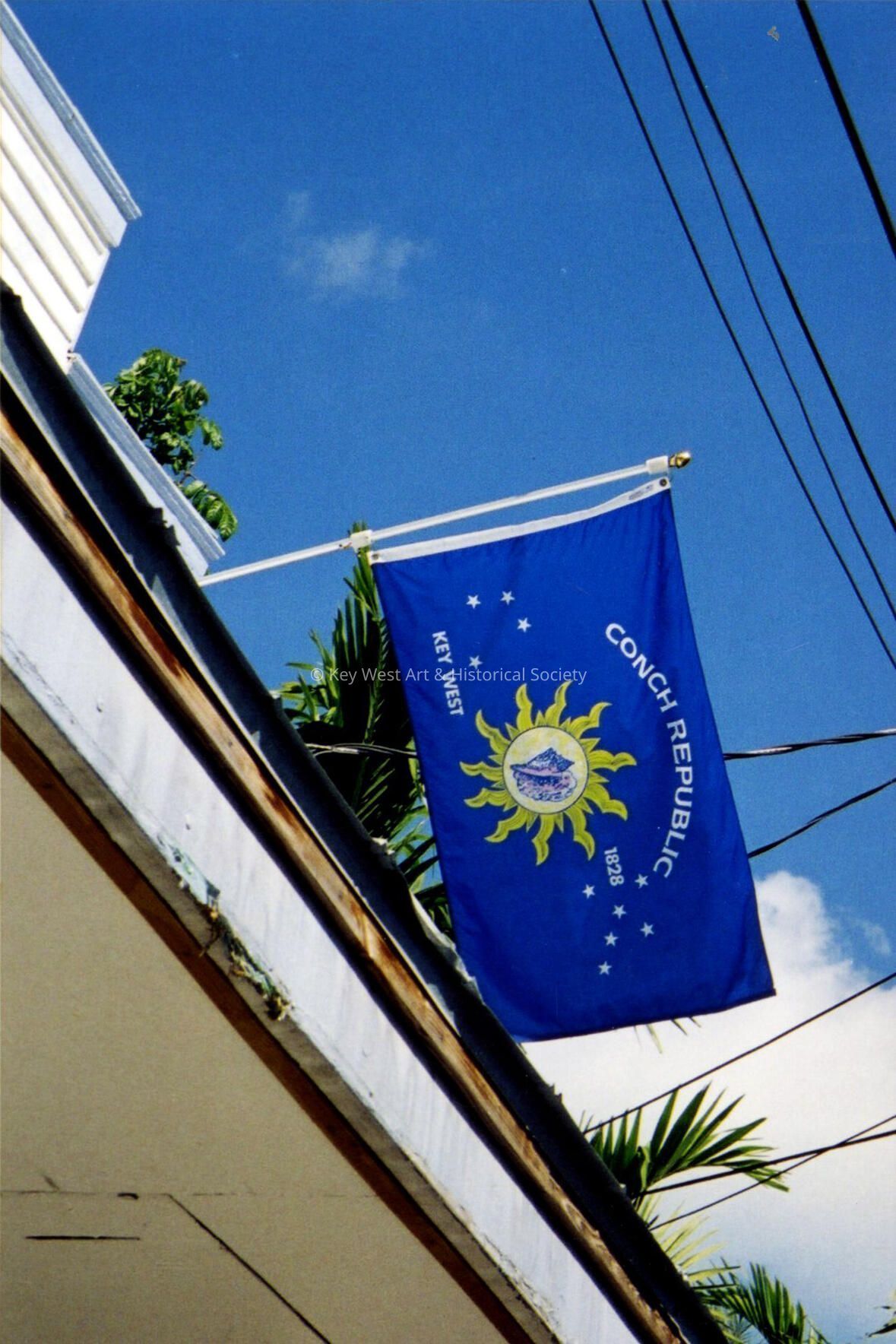 Color photograph taken by historian James M. Goode of a Conch Republic Flag flying at 220 Angela Street during a trip to Key West in February 2001. Printed from Roll 3.