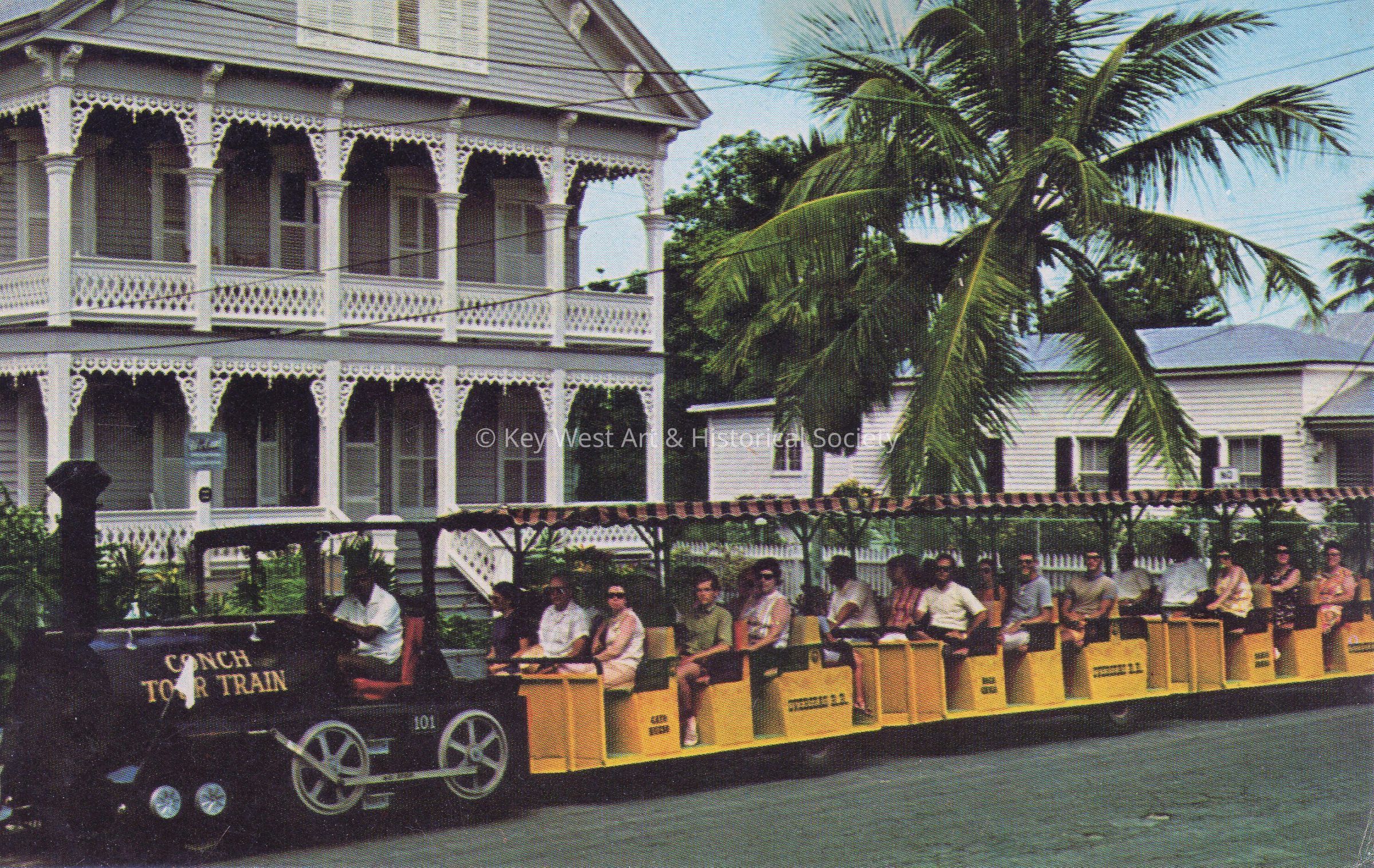Postcard depicting passengers on the Conch Tour Train passing 615 Elizabeth Street. Notation on verso, ‘The train is in front of the gingerbread house, so called because of the elaborate wood work on the porches and columns as seen in this picture.’Subject Place
