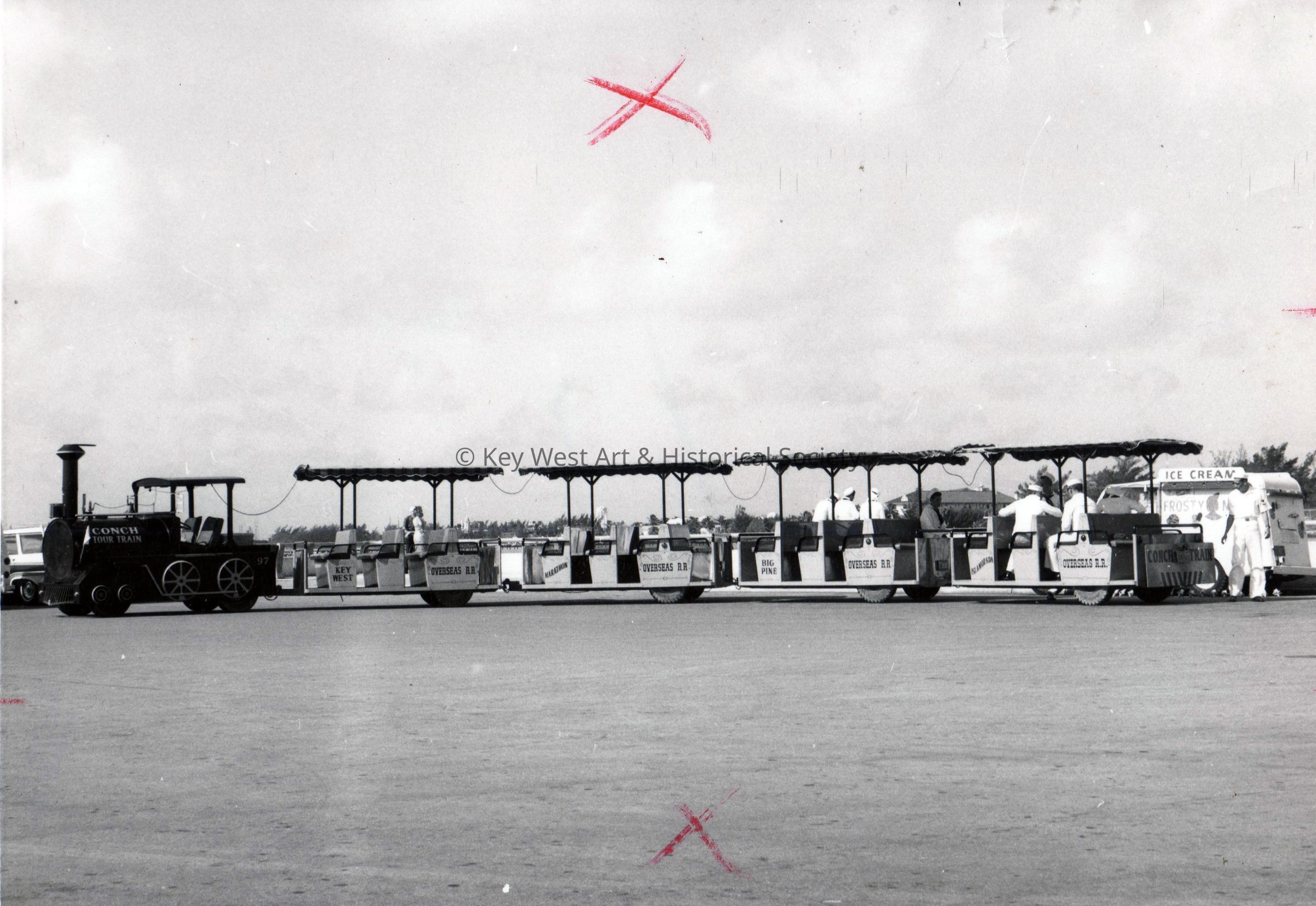 Blank and white photograph of the Conch Tour Train parked alongside an ice cream truck, possibly near Mallory Square.