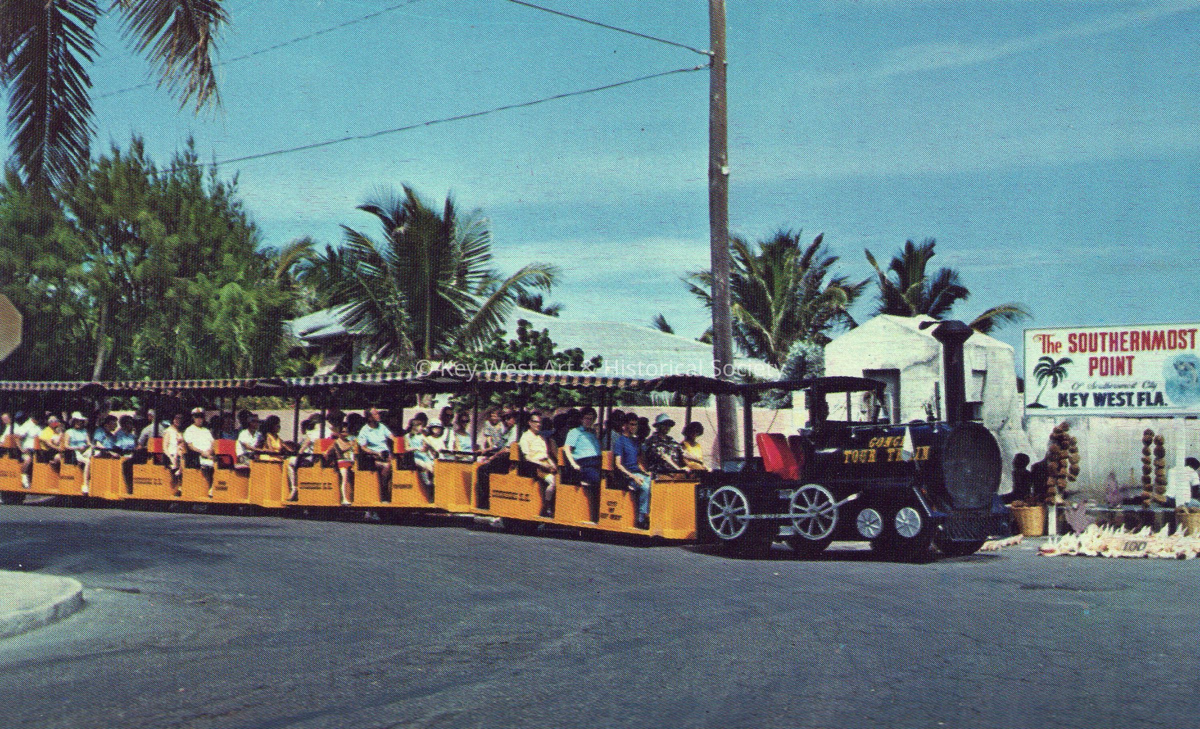 Postcard depicting the Conch Tour Train at the Southernmost Point in Key West, Florida.Subject Place