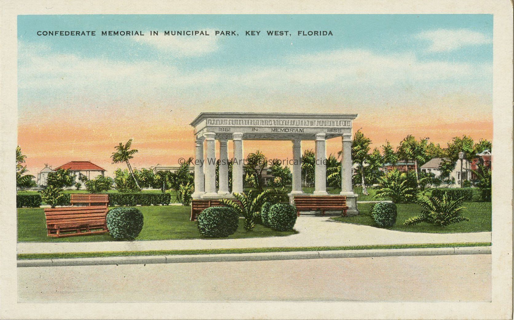 Postcard depicting the Confederate Memorial in Municipal Park in Key West, Florida. Notation on verso, 'This confederate Memorial in Municipal Park was erected and dedicated by the Daughters of the Confederacy of Key West. The name of the chapter is the "Stephen R. Mallory.'Collection
