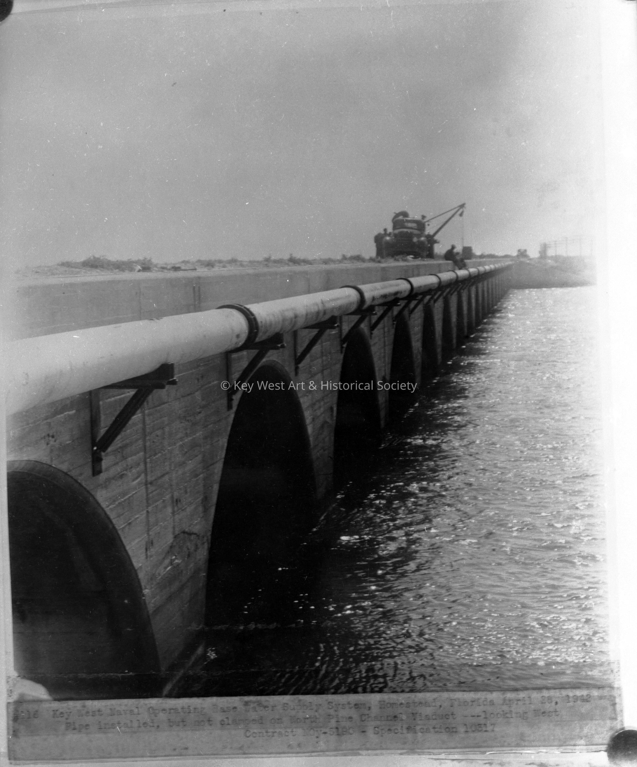Black and white negative showing the construction of the water pipeline installed by the U.S. Navy during World War II to bring mainland water to Key West. Caption reads, 'Key West Naval Operating Base Water Supply System, Homestead, Florida, April 28, 1942. Pipe installed, but not clamped on North Pine Channel Viaduct --- looking West.'Collection