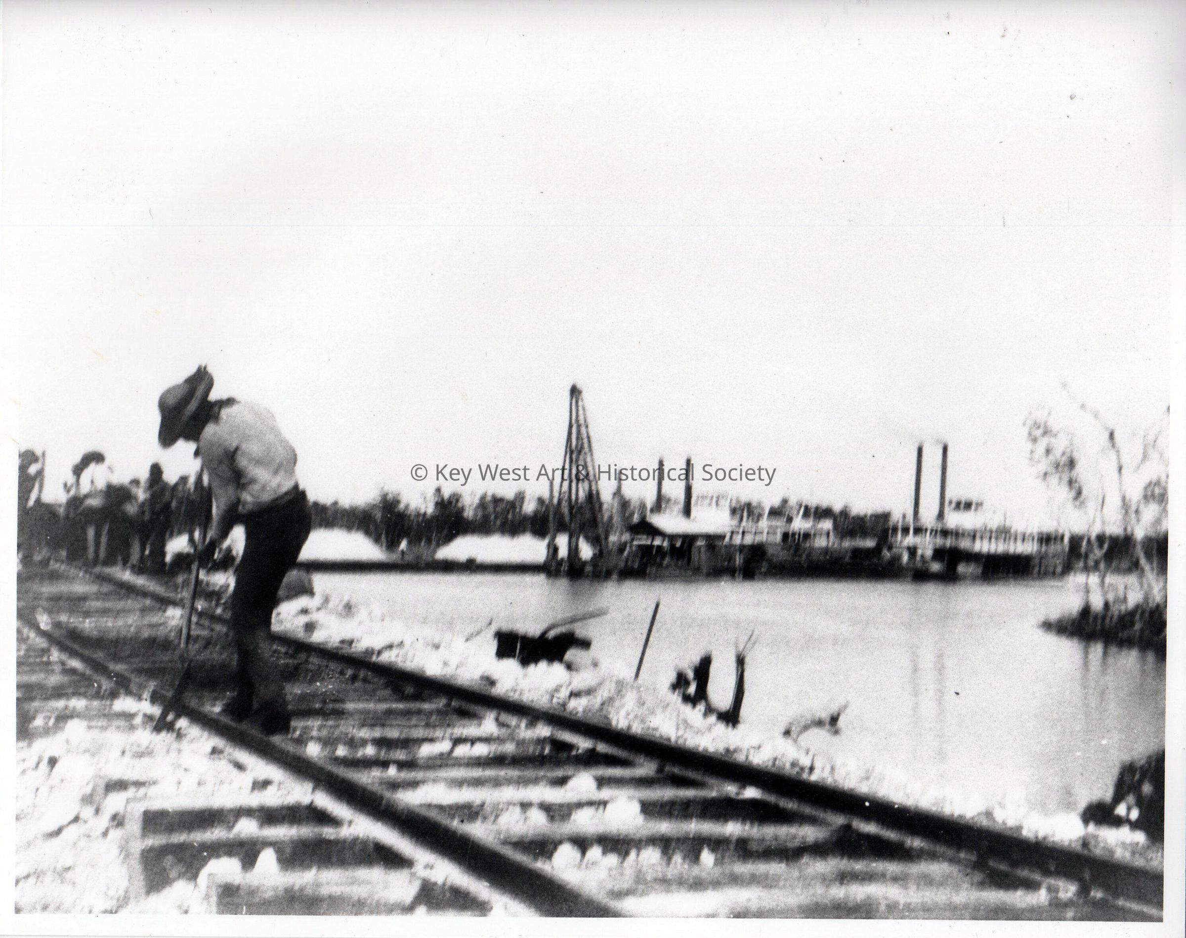 Black and white photograph of men working on a section of the Overseas Railway with steamships in the background.Collection