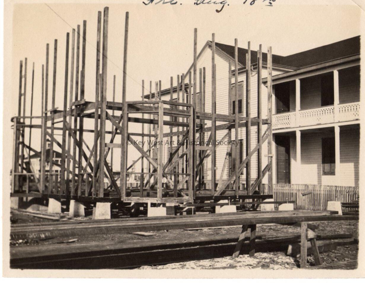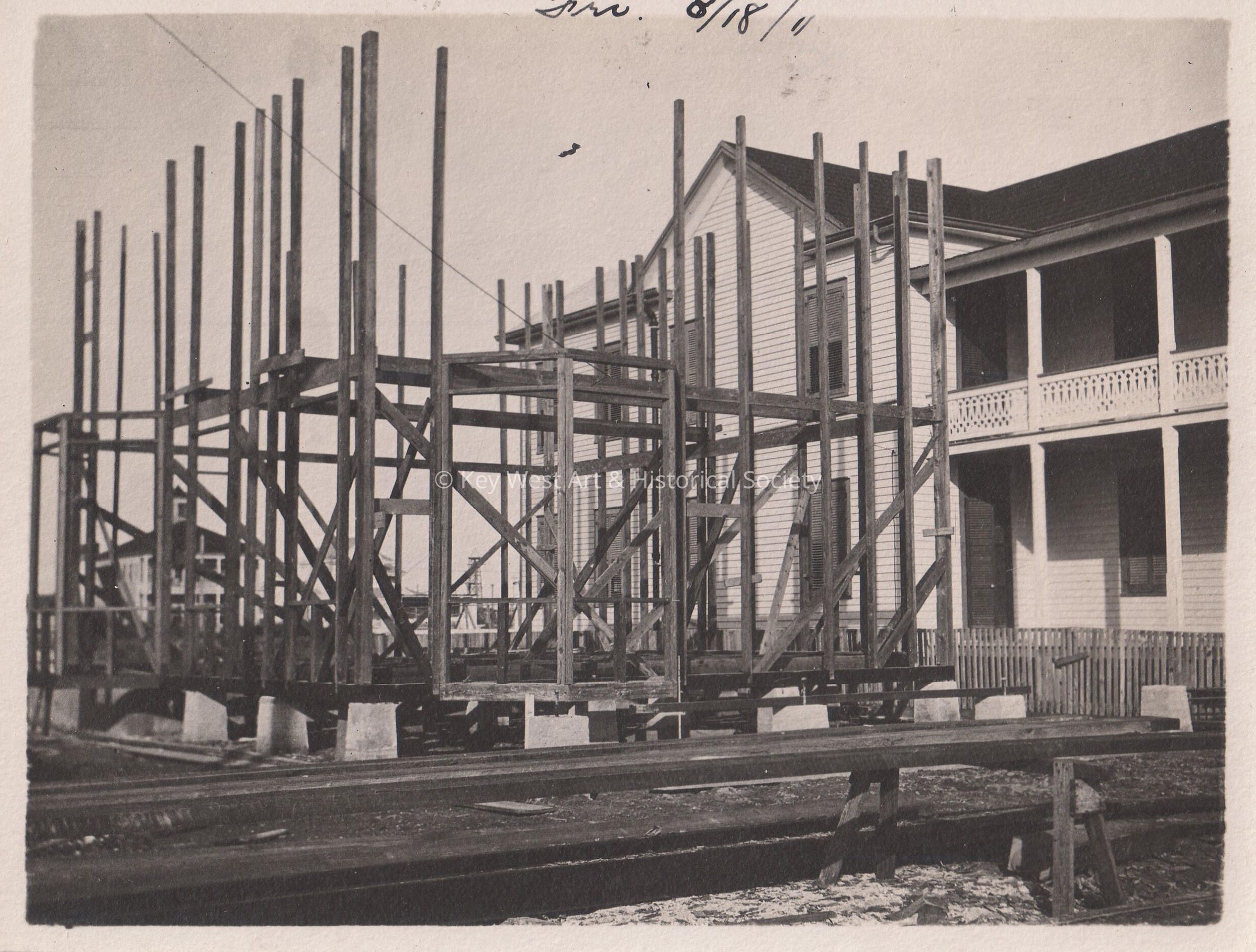 Black and white photograph of an unknown house being built taken on Friday, August 18, 1911. Photograph taken for the Blackstone Gas and Electric Company.Collection