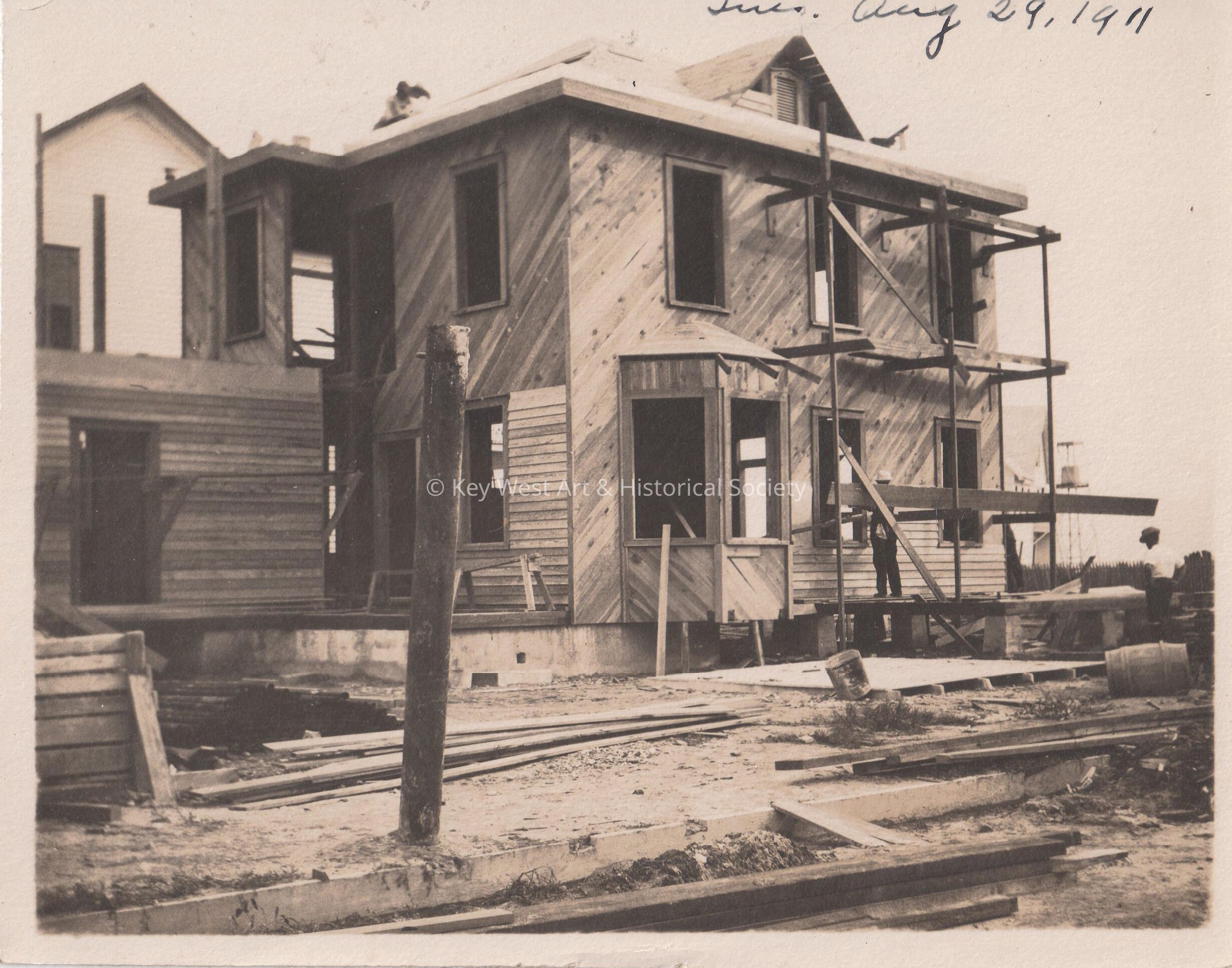 Black and white photograph of an unknown house being built taken on Tuesday, August 29, 1911. Photograph taken for the Blackstone Gas and Electric Company.Collection