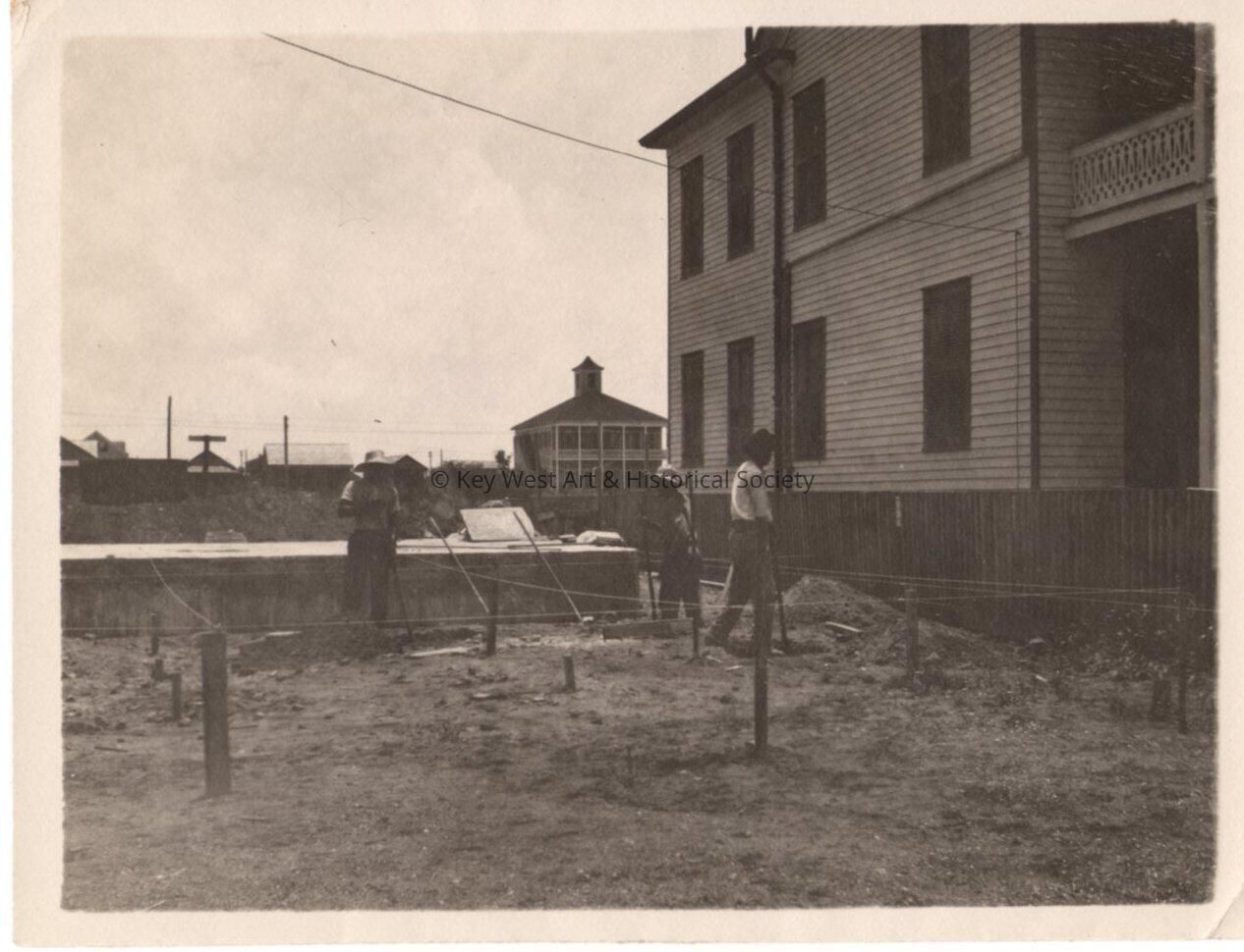 Black and white photo taken from the road showing the foundation of a house being built. Photograph taken for the Blackstone Gas and Electric Company.Collection